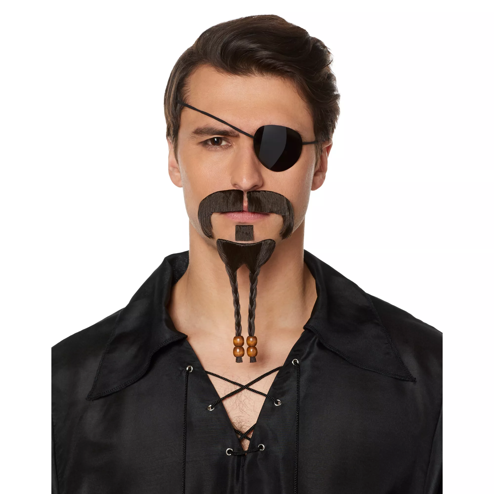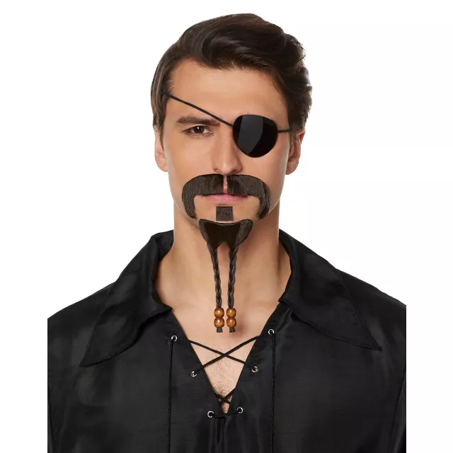 Shiver their timbers when you complete your pirate costume with Pirate Facial Hair. The dark brown rogue mustache comes complete with a matching goatee chin patch.