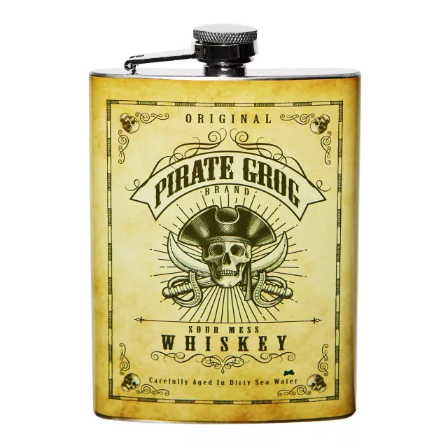 Arrr, ye can't go to the party without this Pirate Grog Flask! This stainless steel flask features an attached screw-on cap that keeps contents secure even in the roughest seas. Complete your pirate look with this flask!
