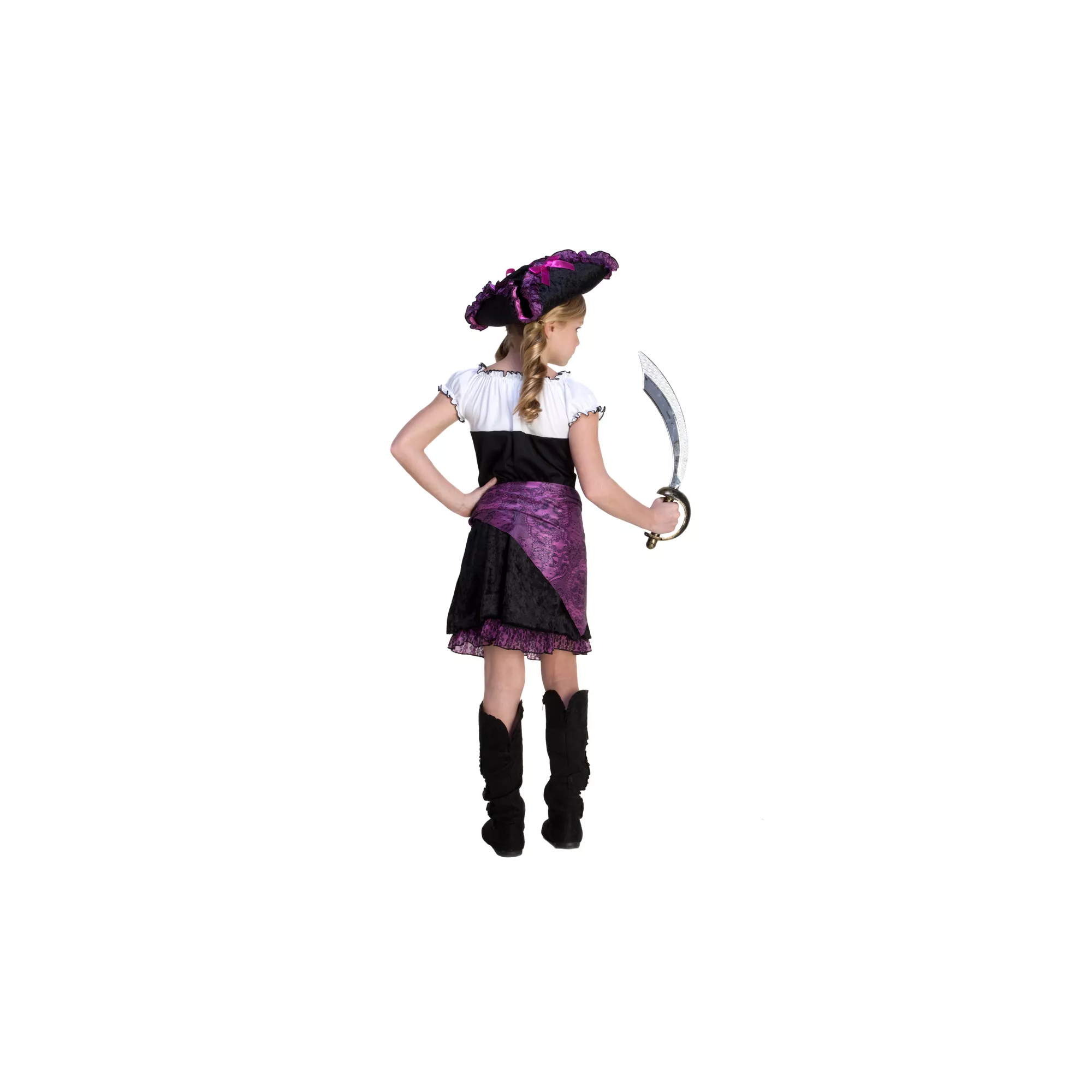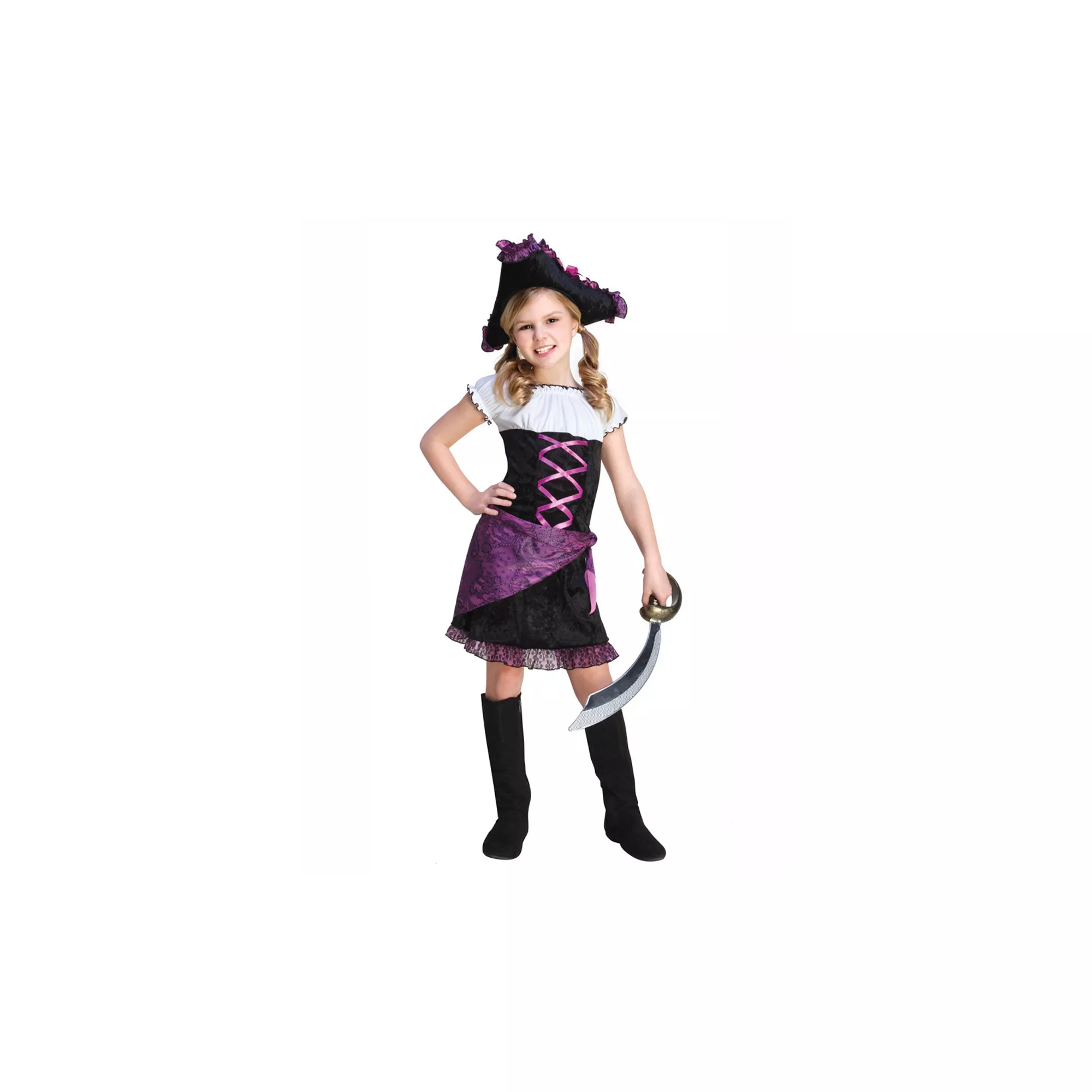 Set sail for a Halloween adventure when you don this pretty purple and black Pirate Princess girls costume. The 100% polyester garment includes a great hat and a fancy waist scarf so you are prepared for any eventuality.