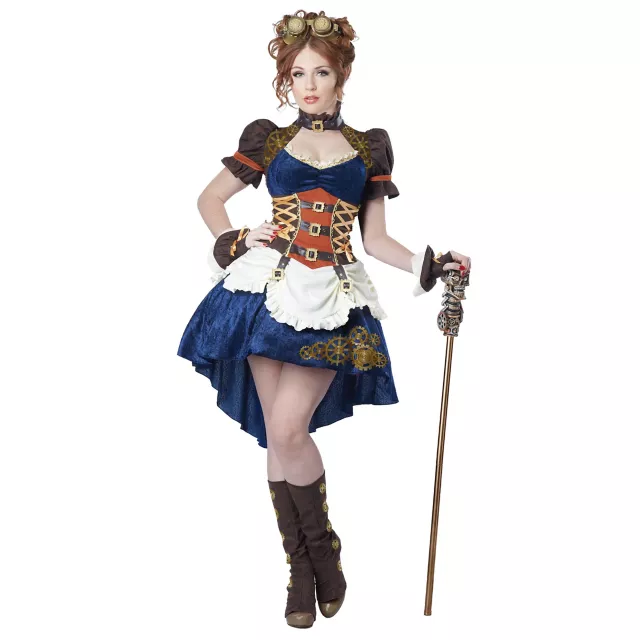Travel into the world of science fiction this Halloween in this Plus Size Steampunk Fantasy Adult Women's Costume! This velvety blue asymmetrical dress has golden gear graphics, a lacy neckline, and an attached corset. The corset features buckle graphics and a ruffled white apron, emphasizing the Victorian influence on Steampunk. Add the matching brown boot spats and glovettes to this costume, and all you'll need is the goggles to have a head-to-toe Steampunk look!