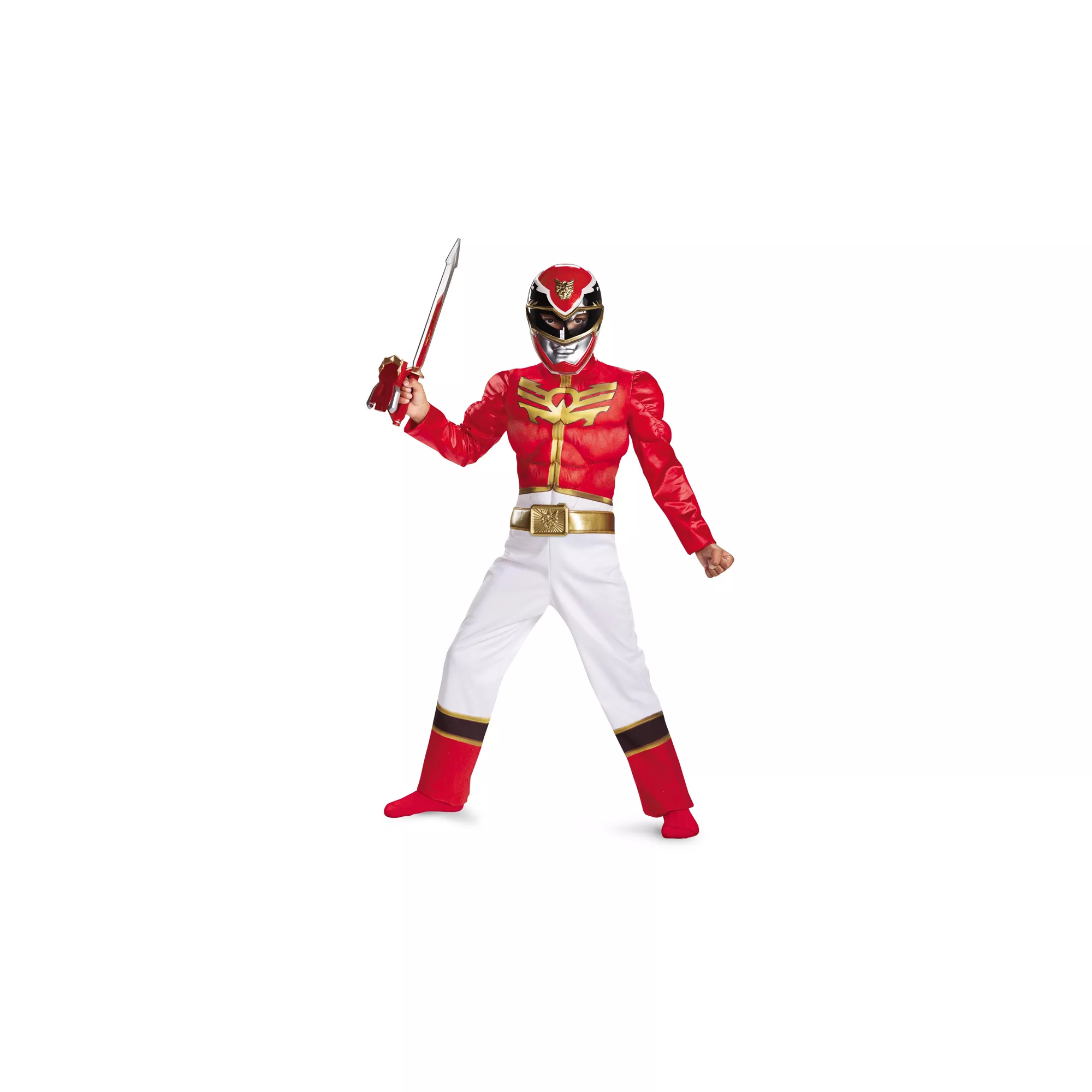 Lead the team into battle on Halloween when you wear this officially licensed Power Rangers Megaforce Red Ranger Boys Costume. The red jumpsuit features muscle torso and arms, complete with attached belt, detachable buckle and matching character mask.