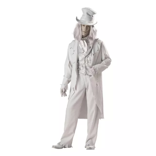 For a spook-tacular Halloween, you'll want to suit up in this Prestige Ghostly Gent Mens Costume and haunt the hallways of the play, party, parade or masquerade ball. Perfect for a haunted house - everyone needs an ancestor who just won't leave! Steal the spotlight in this coat, vest with attached shirt sleeves, pants, dickie with scarf collar and hat all tattered for aged effect plus gloves and wig and scare the living daylights out of all you encounter.