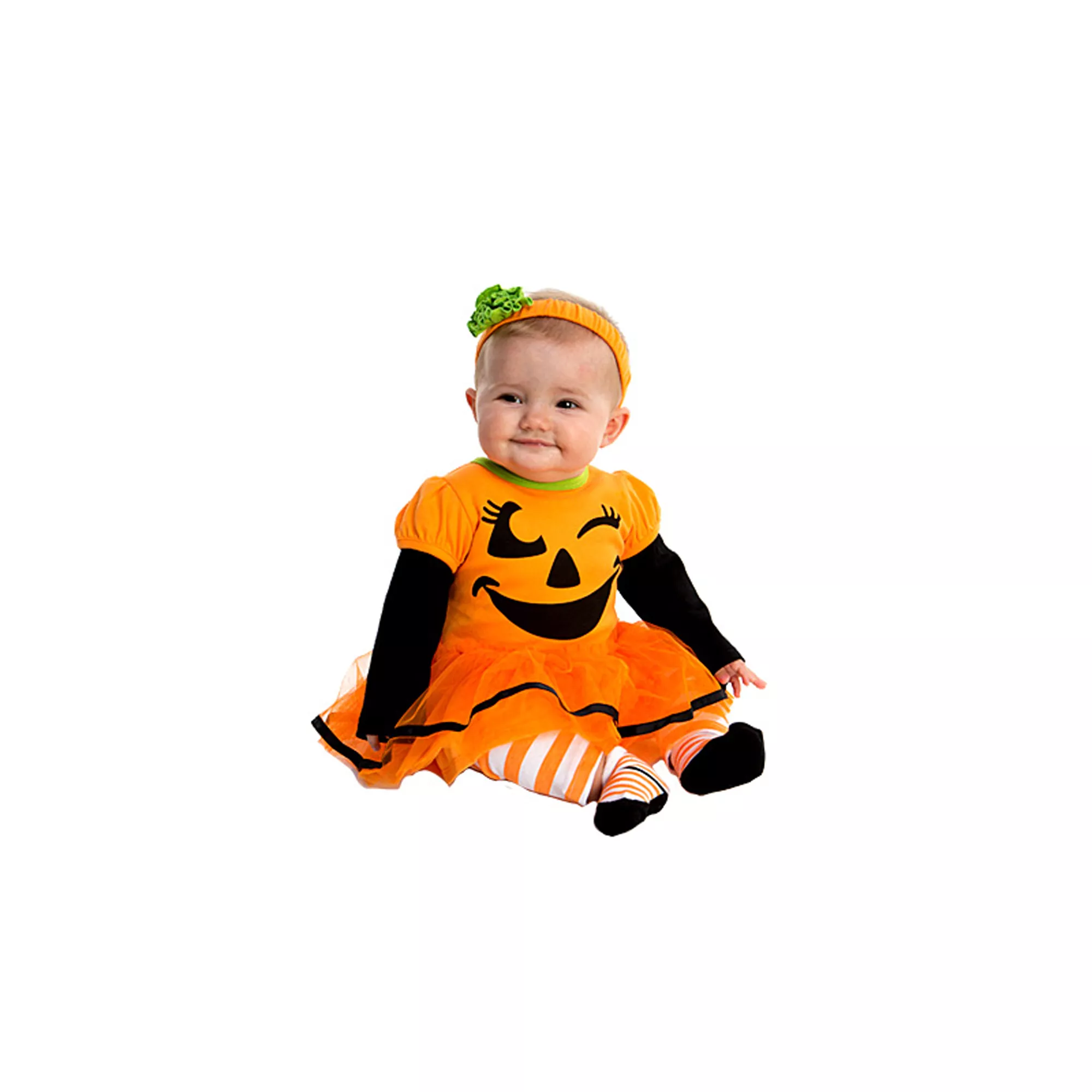 Your little munchkin will be beyond adorable when you dress them in this Pumpkin Cutie Baby Costume. Orange and black jack-o-lantern top comes complete with skirted pants, matching headband and socks.