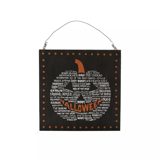 Turn your home into Halloween central with this adorable pumpkin sign. The featured jackolantern is made up of words related to the holiday! The perfect addition to your Halloween décor.