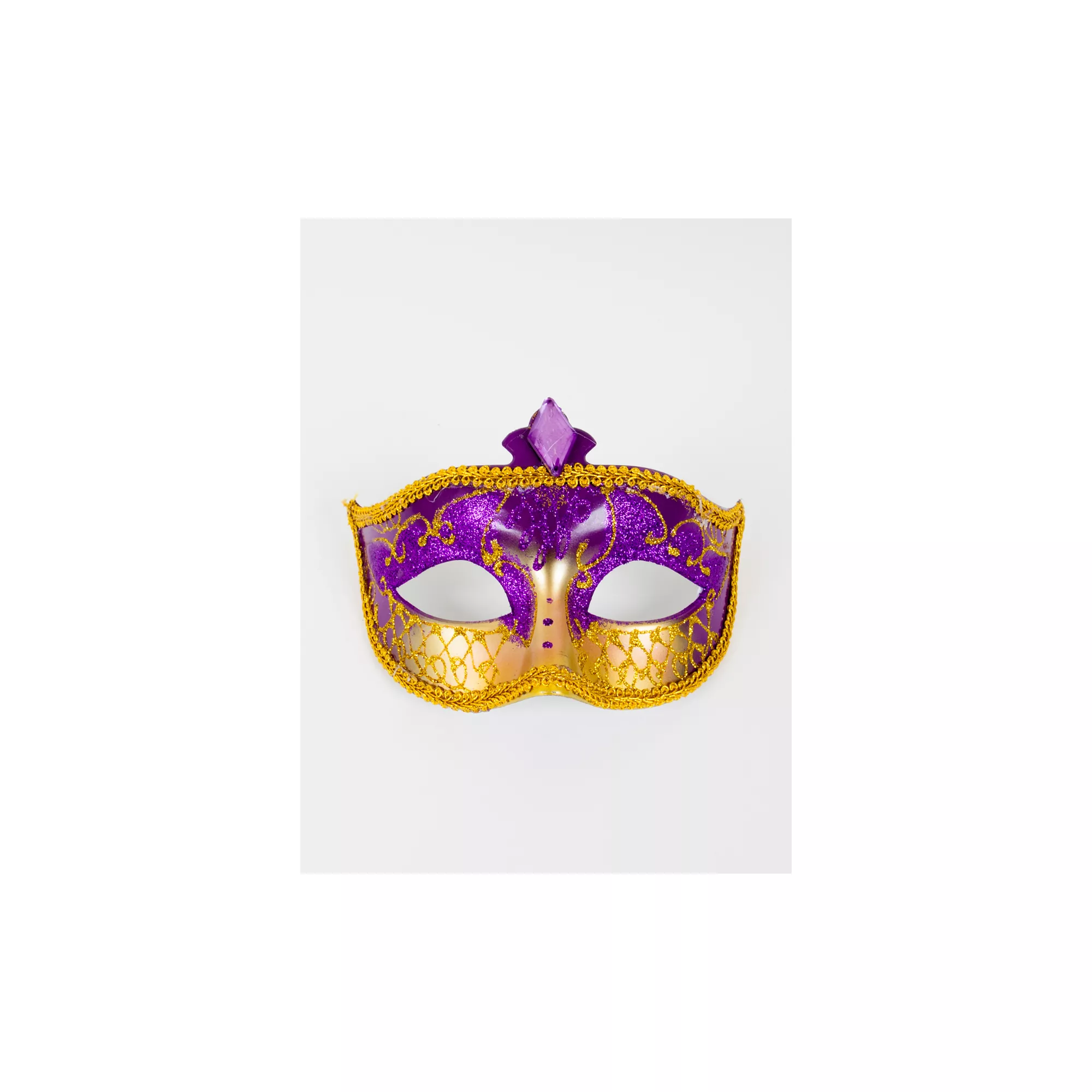 Conceal your identity and add a note of intrigue to your costume when you don the purple and gold Carnival mask. It is ideal for a masquerade ball, Mardi Gras or Halloween.
