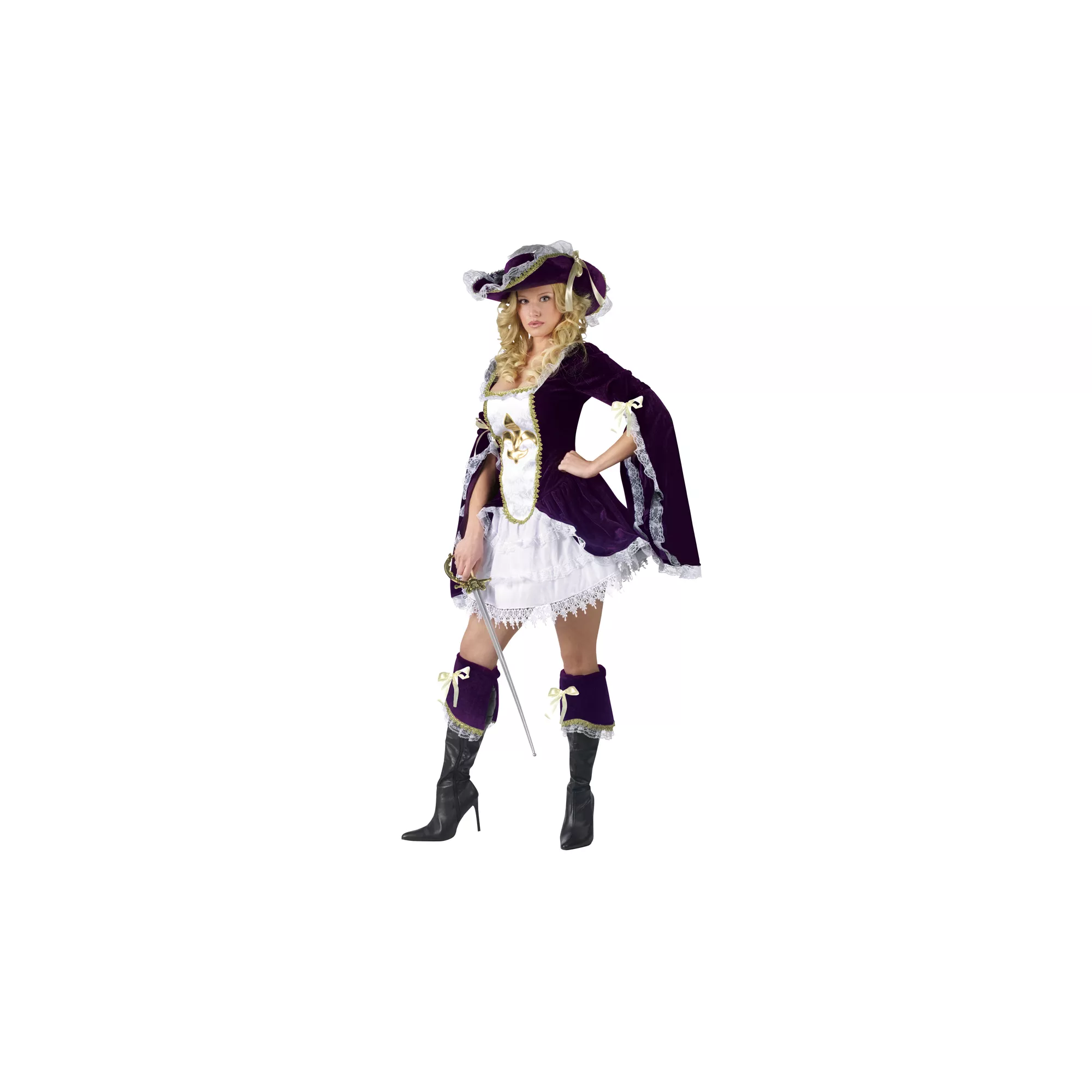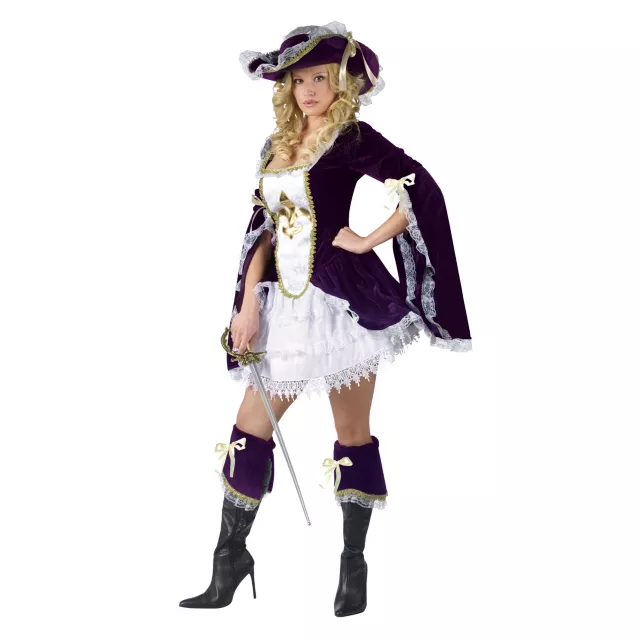 It's one for all and all for you in this Purple Madam Musketeer adult womens costume. The elaborate purple, white and gold dress of this sexy womens costume is styled to look like a jacket over a dress and features lace-trimmed sleeves and a gold-trimmed bodice. A petticoat, boot cuffs and a matching hat complete with womens Musketeer costume.