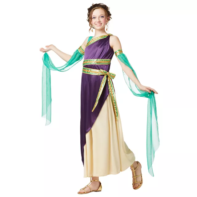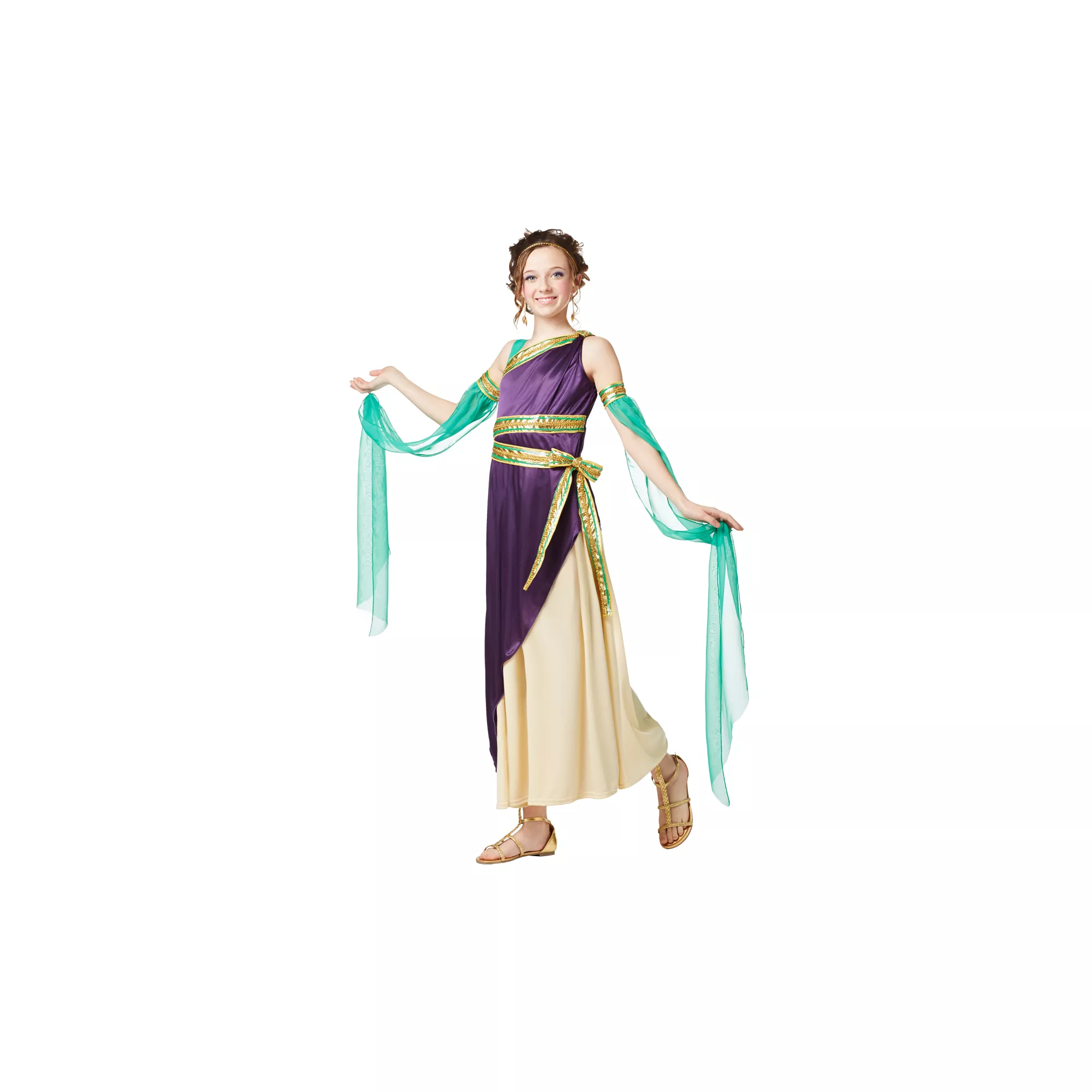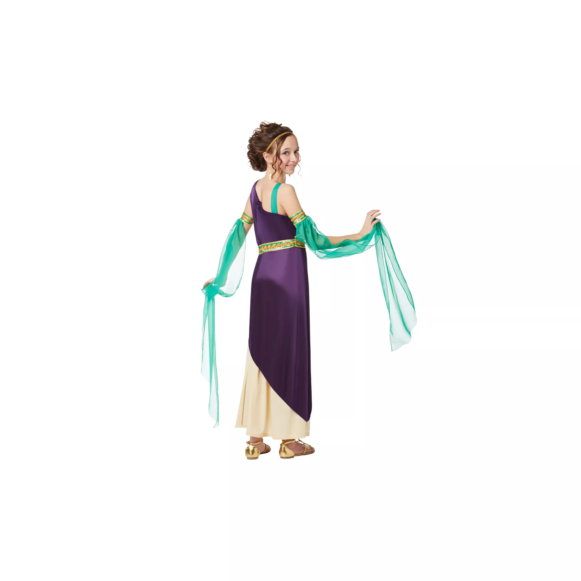 Roam along this Halloween and share your magic in the Purple Roman Goddess Child Costume. You'll shine in this purple gown with green and gold belt, trim and matching armbands with teal drapes.