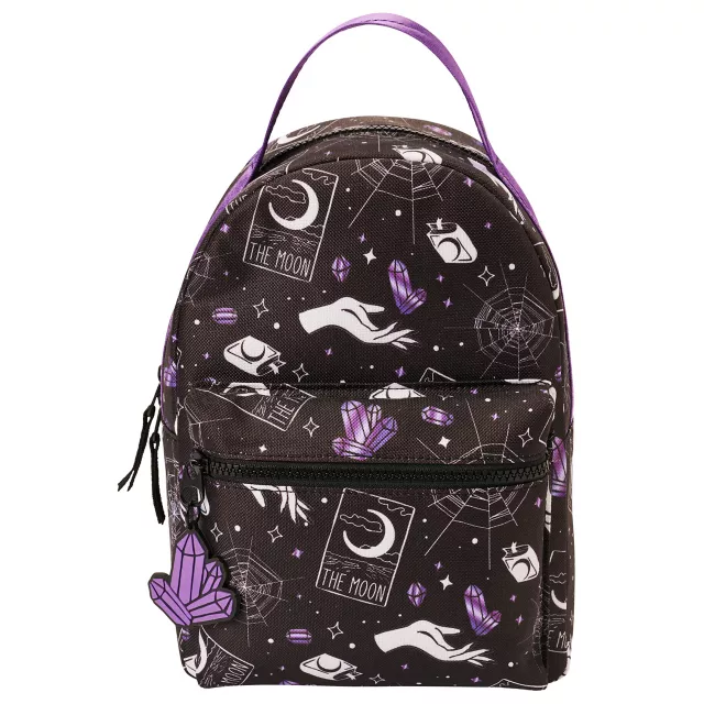 Grab your crystals and go with this adorable Purple Tarot Backpack. This black and purple backpack features the cutest celestial print of tarot, crystals, spiderwebs, and more.