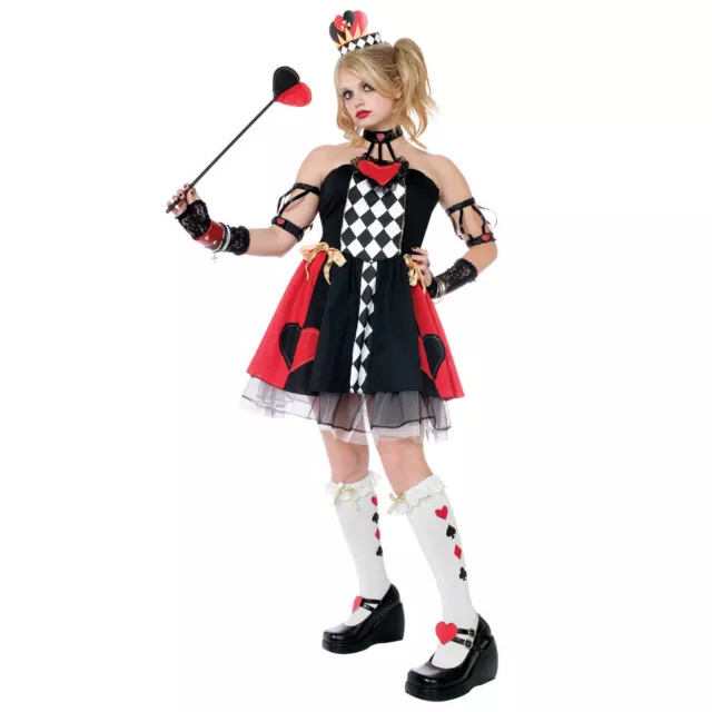 They'll fall for you like a house of cards when you wear this classic Queen of Hearts costume. In the black, white, and red character dress with matching sleeves and choker of this cute costume, you'll be sure to turn heads, even if you don't get to cut any off! Punk up this Halloween costume with heart-themed stockings and fingerless black gloves.