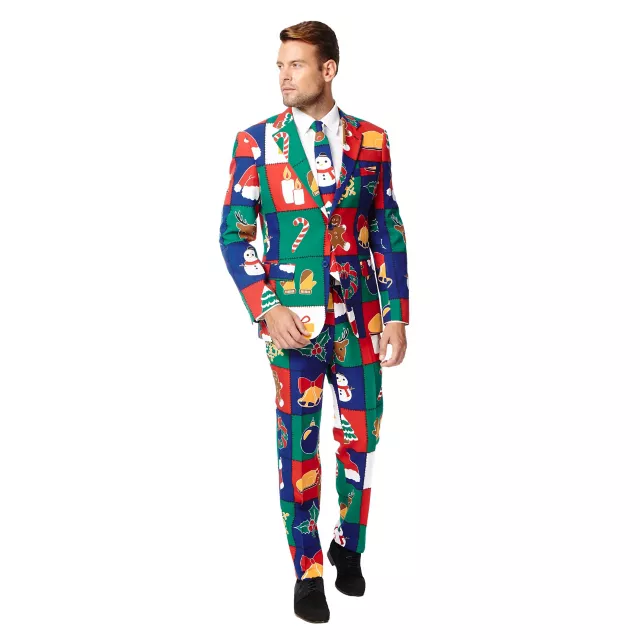 The Quilty Pleasure Party Suit isn't your Grandma's quilted creation! Show up to the party in the snazziest way possible with this handsome holiday suit, which includes jacket, pants, and tie. The compliments will keep coming when you wear this slim fit suit which includes a quilted print with snowmen, bells, candy canes, and more. Made of high quality materials, you'll want to wear this suit long after the holidays! Pants come with 1.5 inches of extra material at the seam, so they can be perfectly tailored to your body.