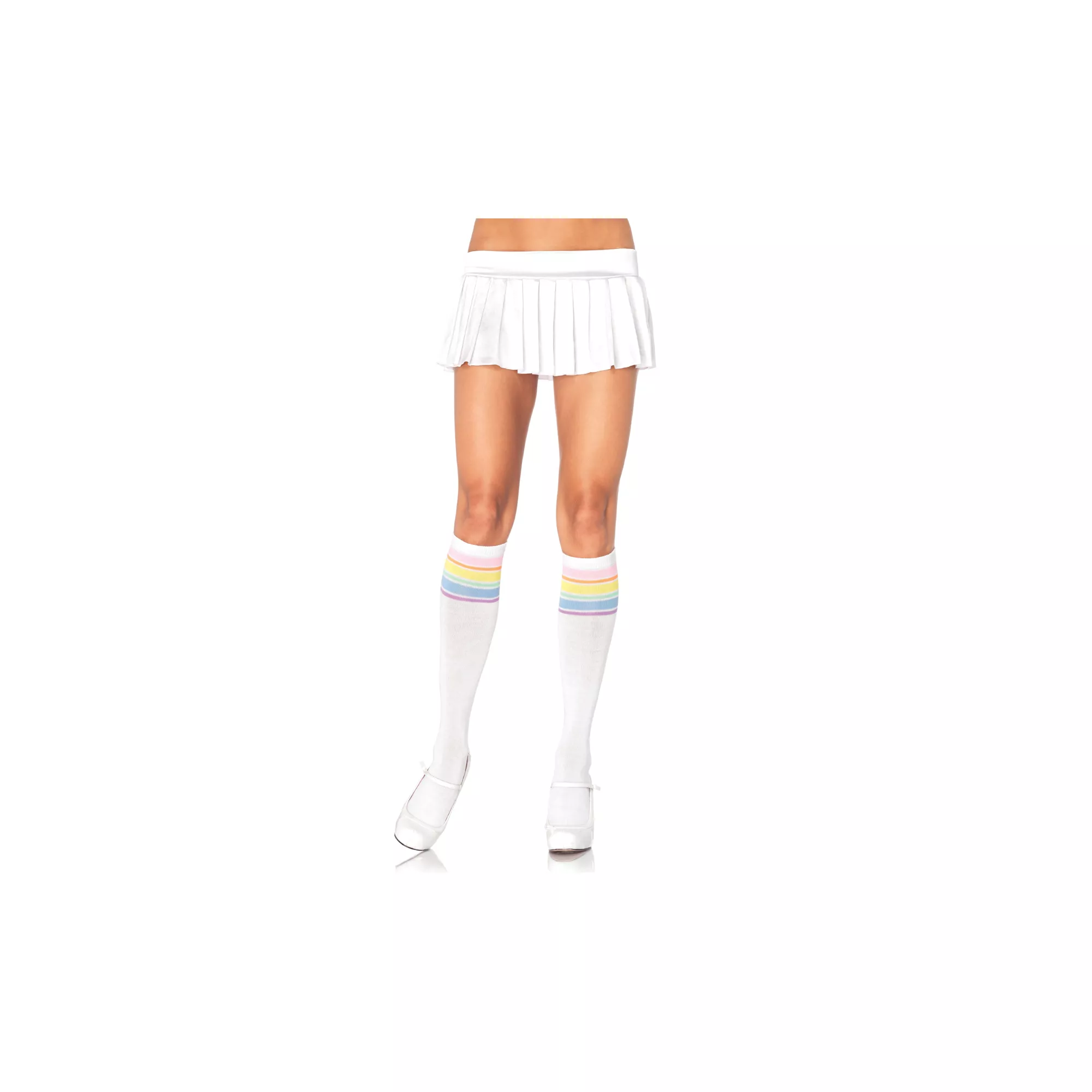 Incorporate a little color into any costume look with the Rainbow Athletic Knee High. These white knee highs have rainbow stripes at the top of the knee high.