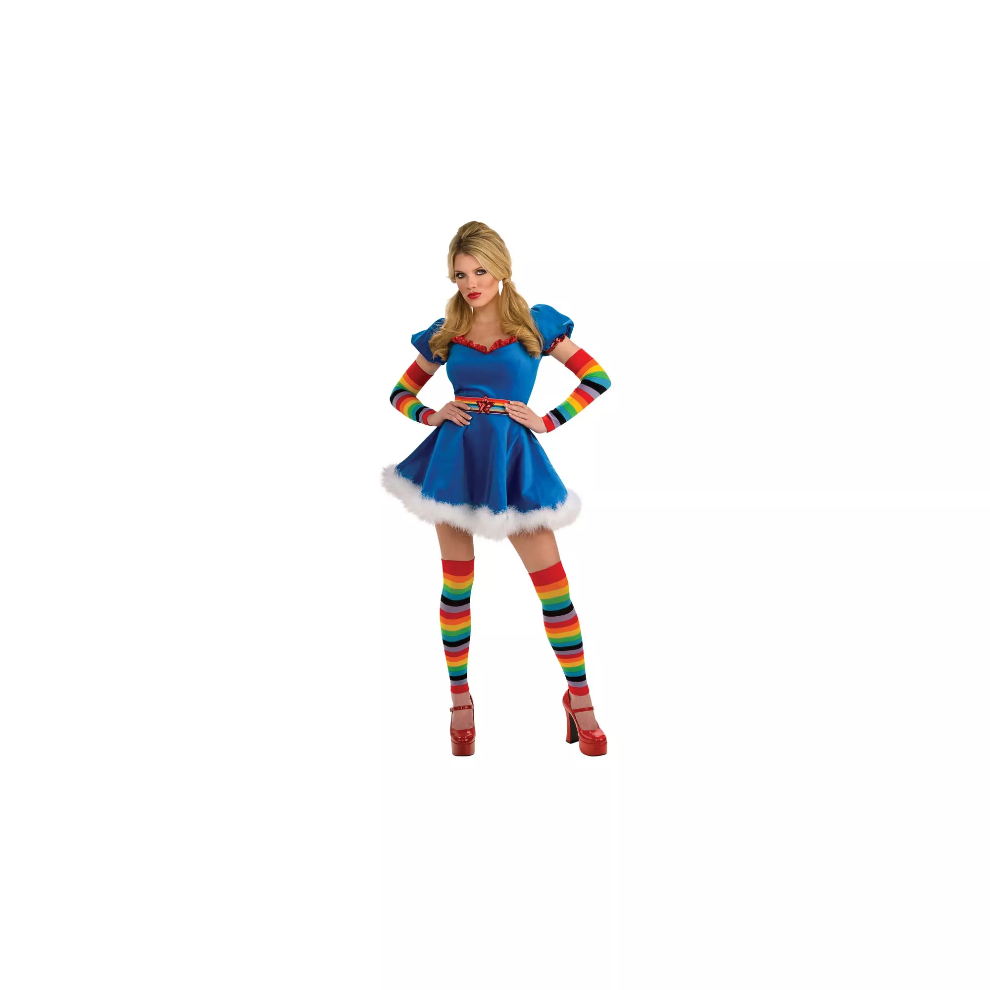You'll be the treasure at the end of every rainbow when you wear this Rainbow Girl adult womens costume! This blue, 100% polyester dress features puffy sleeves, red ruffle and white faux fur trim, complete with rainbow striped sleevelets, matching stockings and belt.