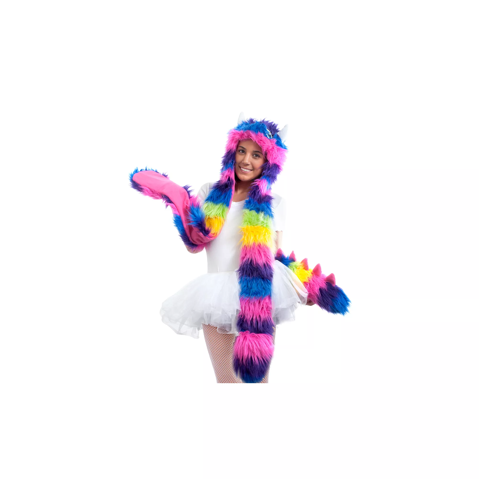 You'll be a refreshing sight in the Rainbow Monster Snood and Tail. Show that not all monsters are scary on Halloween in this fuzzy, rainbow-colored snood with spiked tailed attachment.