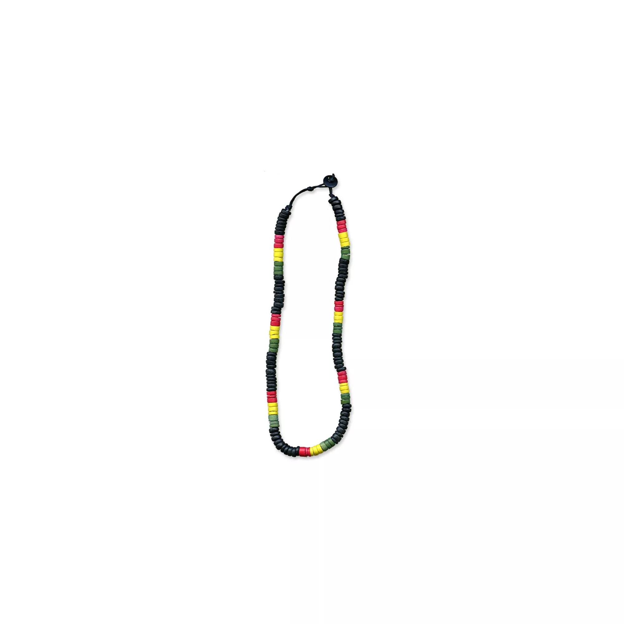 The Rasta Necklace features green, black, yellow and red wood beads on an 18-inch chain.