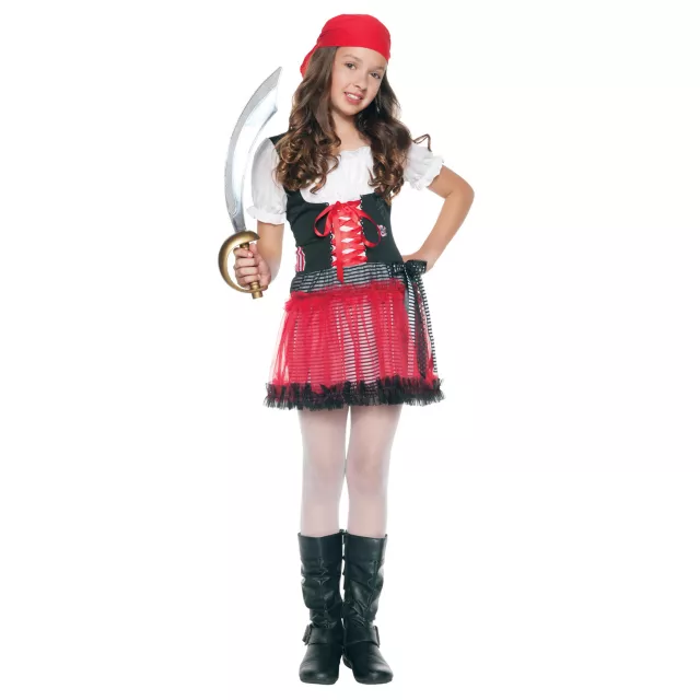 Become the treasure everyone's been looking for when you wear this Red Pirate girls costume. The funky patchwork style looks like you've been away at sea for some time. This 100% polyester dress with peasant top comes complete with laced bodice and red headpiece.