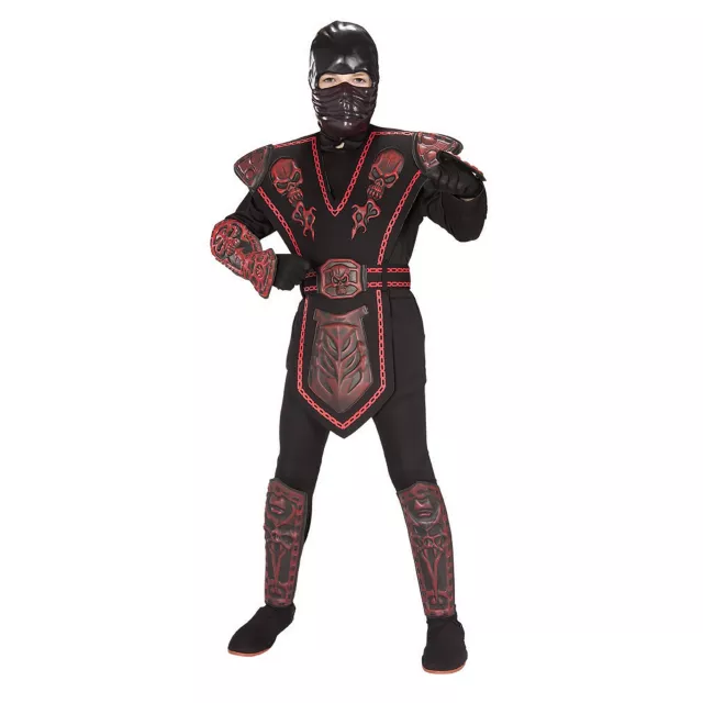 Dangerous and deadly, you'll operate in the shadows when you wear this Red Skull Ninja child costume. The black and red, 100% polyester hooded jumpsuit of this ninja costume features an EVA chest piece and comes complete with matching arm and leg guards along with a black molded mask.