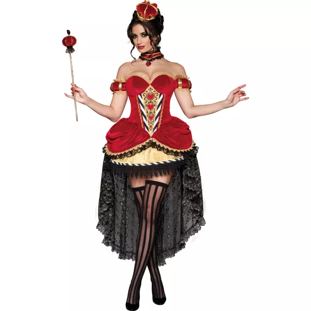 Make them obey your every command when you wear this Regal Queen of Hearts adult womens costume. The red velvet and gold brocade dress of this sexy womens Halloween costume features a corset-like boning, attached petticoat, red choker, jewel heart pendant and a gold crown with heart accents.