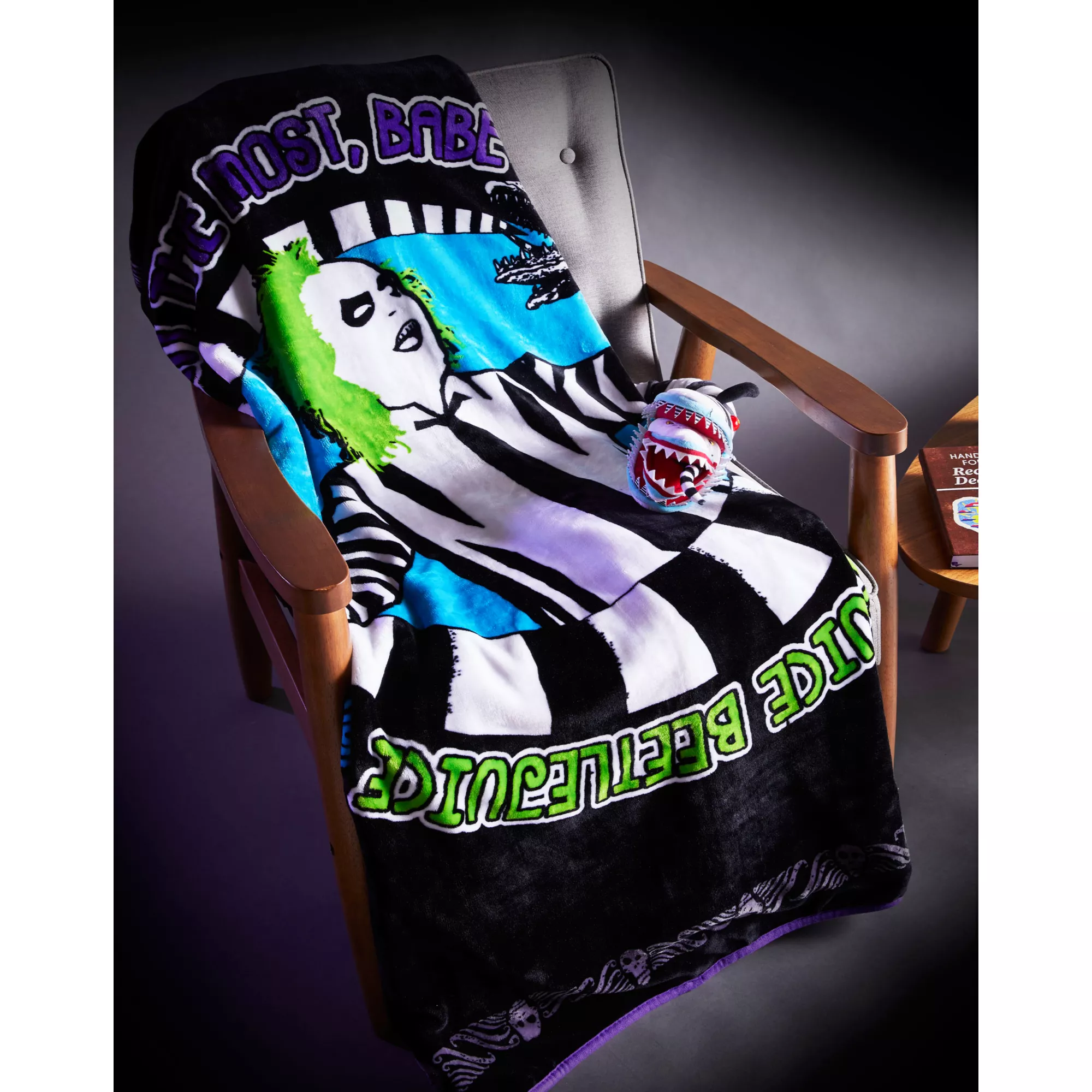 Catch some Z's with your old pal Beetlejuice with this comfortable piece of Halloween movie history. The Beetlejuice reversible fleece blanket is perfect for the bed, couch, or hanging on the wall: one side is Beetlejuice himself, the other is the iconic white and black stripes and Beetlejuice logo.