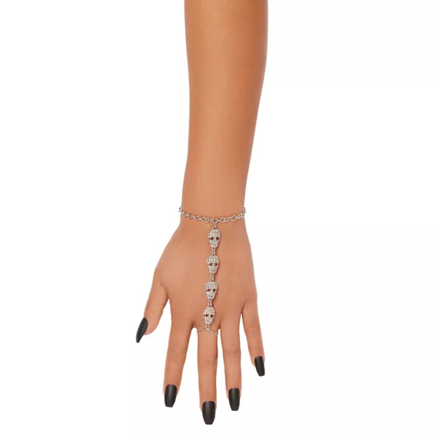Complete any Skeleton, Witch, or other Halloween costume with this exclusive Rhinestone Skeleton Hand Chain! This dainty hand chain is perfect for Halloween or all-year wear!