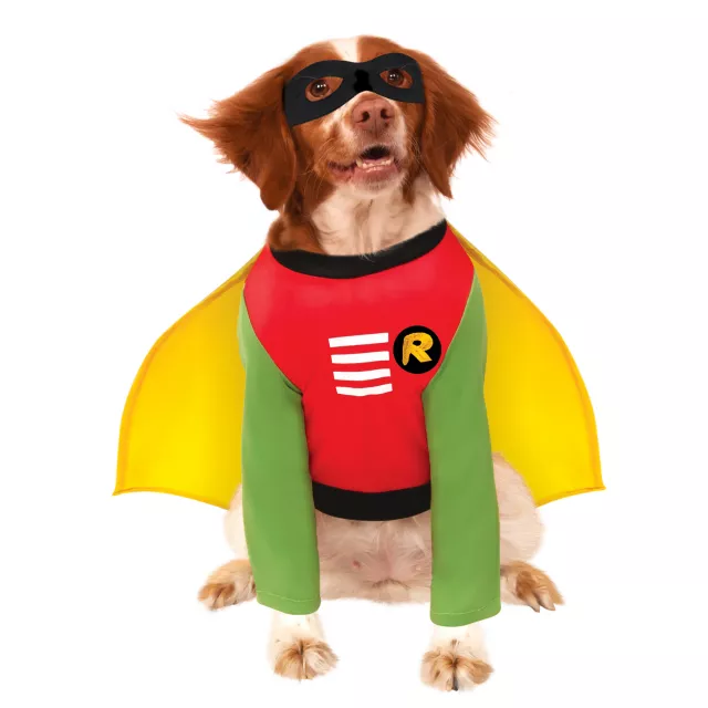 Every superhero needs a sidekick! If you're going as batman this Halloween, dress your best friend in the officially licensed Robin Pet Costume. Shirt with detachable cape and eye mask are included so he'll be ready to go!