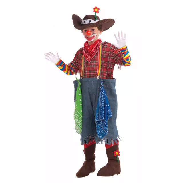 Steal the show when you decide to wear this Rodeo Clown Child Costume. Cowboy hat features flower and comes complete with 3 bandanas, shirt with attached sleeves, suspenders, pants and boot tops.