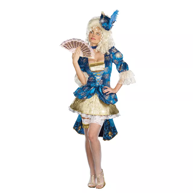 Be decadent and divine when you rule the party in this decidedly different Royal Rendezvous adult womens costume. The elaborate blue, white and gold dress features a flirty bustle and comes complete with a fan, choker, leg garter and an amazingly unique hat.