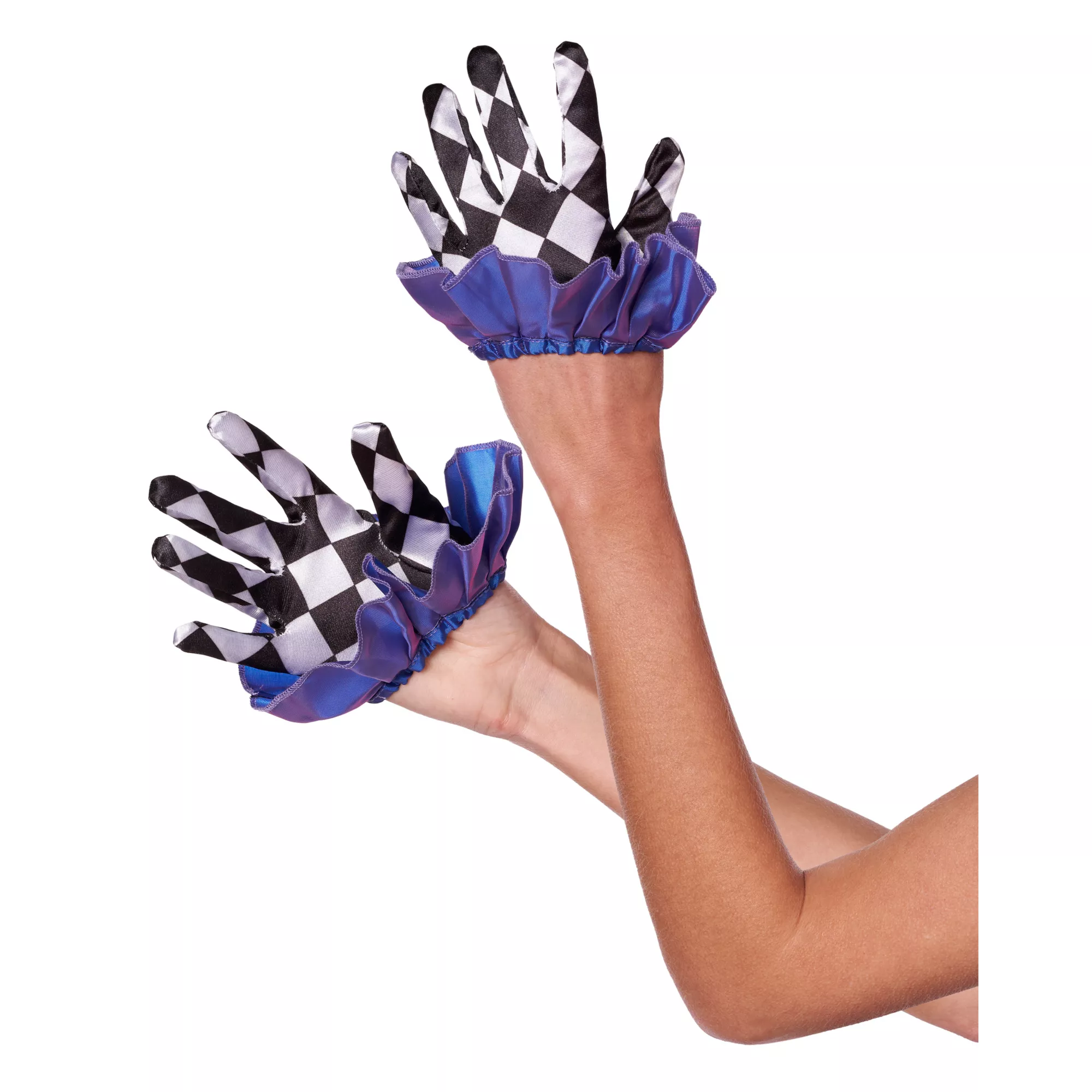 Your clown costume won't be complete without these ruffle gloves! Covered in checkered print and accented with a ruffle detail, you'll be ready for your circus performance.
