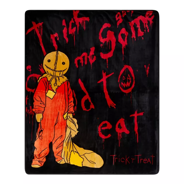 Celebrate your favorite horror movie character with this official Trick 'r Treat Sam Reversible Fleece Blanket! This double-sided blanket features Sam in all his glory on one side with the words "Trick 'r Treat give me something good to eat" and on the other side, images of Sam's head and his bitten lollipop. Whichever side you use, this plush fleece blanket is the perfect way for any horror movie fan to keep warm!
