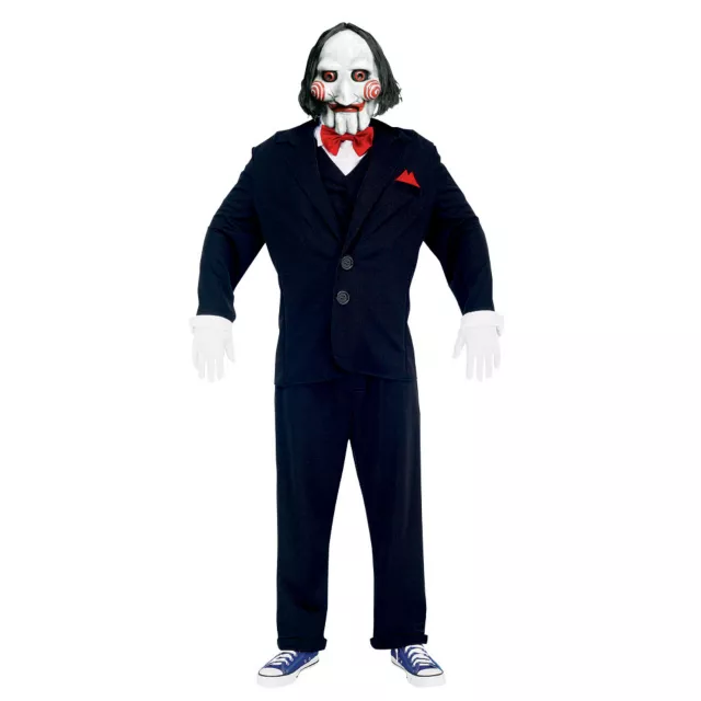 Terrify your friends when you dress in this officially licensed Saw Puppet adult costume this Halloween! The black jacket comes complete with a white dickie, red pocket square and tie, white gloves, character mask and wig.