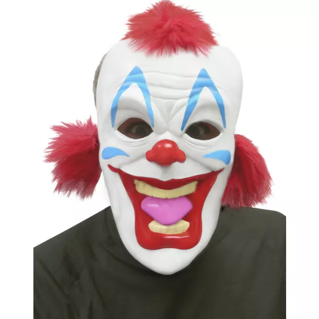 Why do people hate clowns? It's easy to understand their fear when you see this Scary Clown Mask! Have the last laugh in this maniacal clown mask that comes complete with red fright hair - scary! Ideal for Insane Clown Posse fans. This is crafted of white plastic with pink, red and blue accents and red faux fright hair.