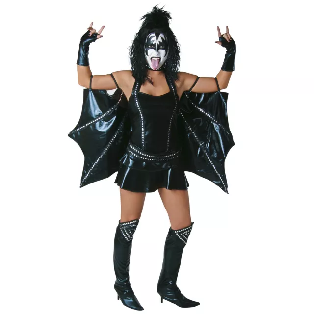 Live large and party like a rock star in this officially licensed Sexy KISS Demon adult womens costume. Rock Halloween in the black and silver mini dress, complete with matching belt, black bat-like cape, black wrist covers and black and silver boot covers.