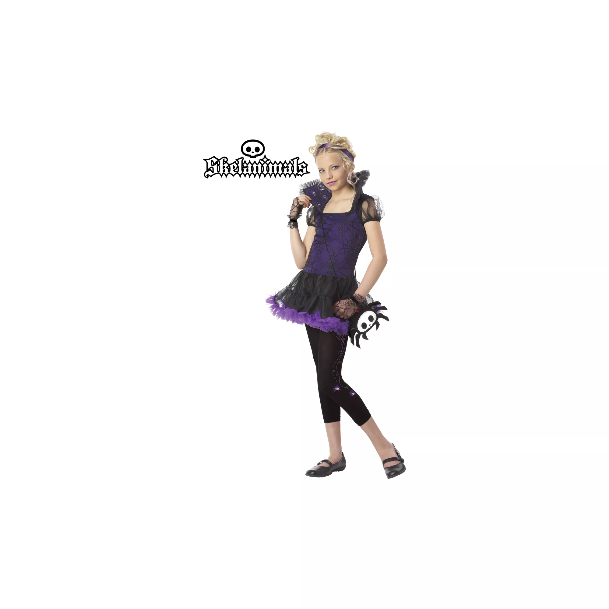 Weave a web of Halloween fun when you wear the officially licensed Skelanimals Timmy the Spider girls costume. This clever, 100% polyester dress comes complete with stand-up collar, skirt and pettiskirt, leggings, belt, mini hat and glovelettes.