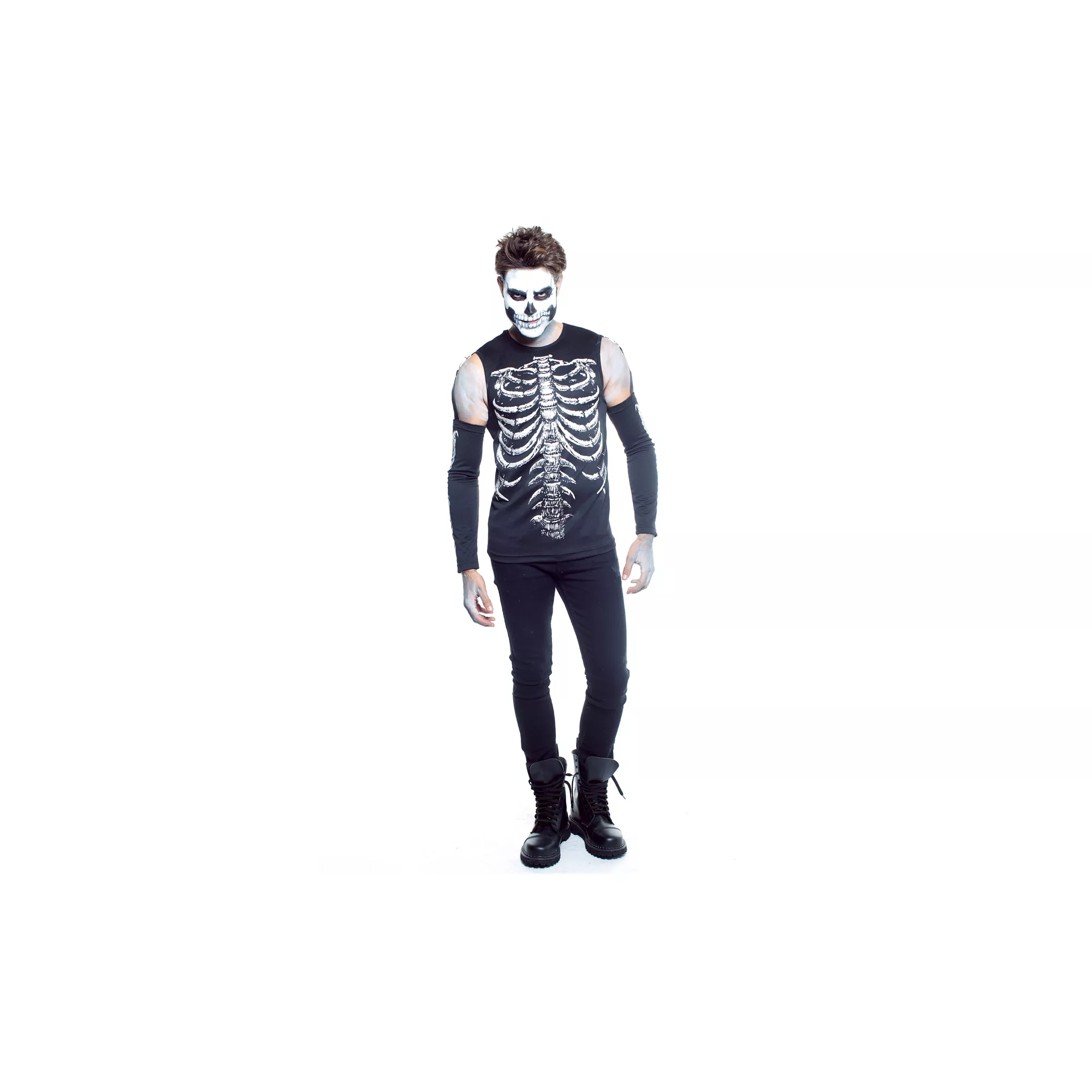 Sticks and stones won't break your bones in this Skele Tony Adult Mens Costume. Boney printed shirt and arm warmers make a great start to a spooktastic costume!
