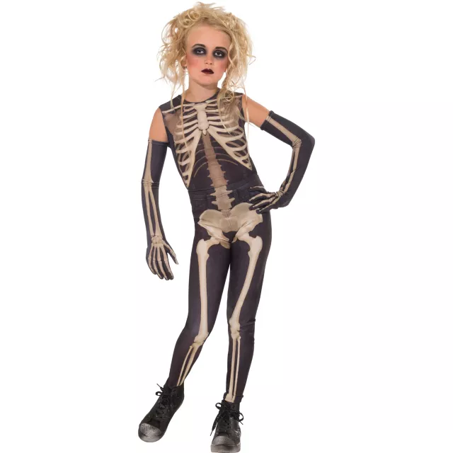 Sticks and stones may break my bones but monsters will never hurt me! The Halloween ghouls won't dare mess with you in this Skeleton Child Girls Costume.Top, jeggings, and gloves give you the complete skeletal makeover so you'll only be baring bones this Hallow's Eve!