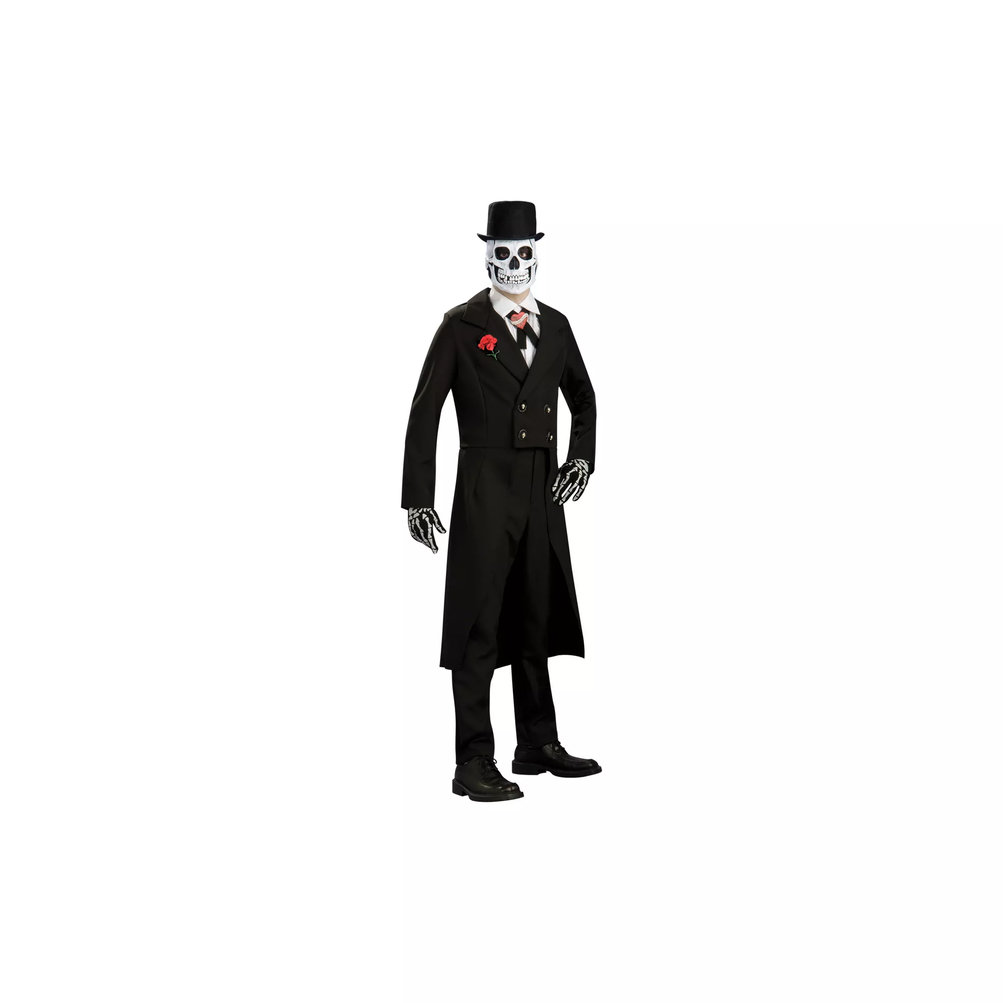 Await your skeleton bride while you wear this elaborate Skeleton Groom Grand Heritage Men's Costume. Black tail coat comes complete with a top hat, dickie with attached tie, mask and a carnation.