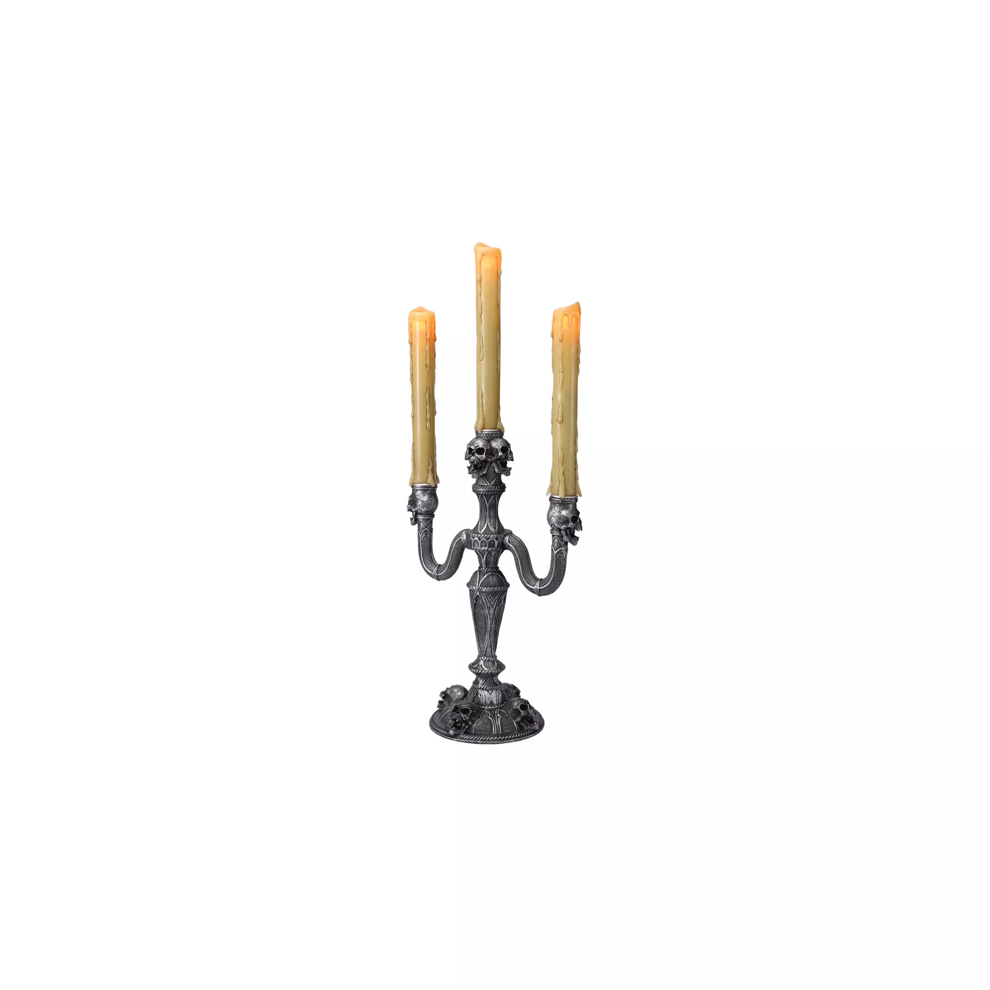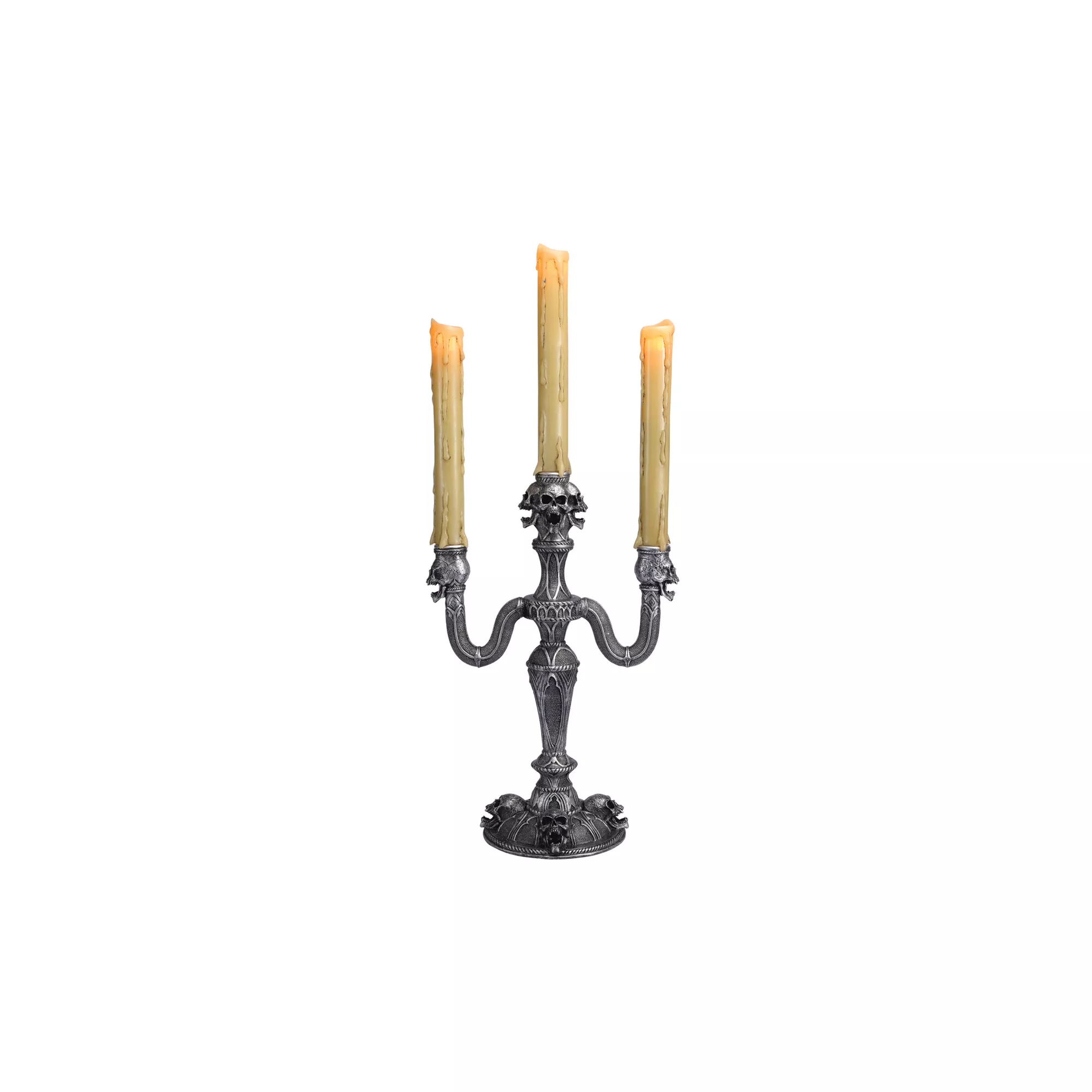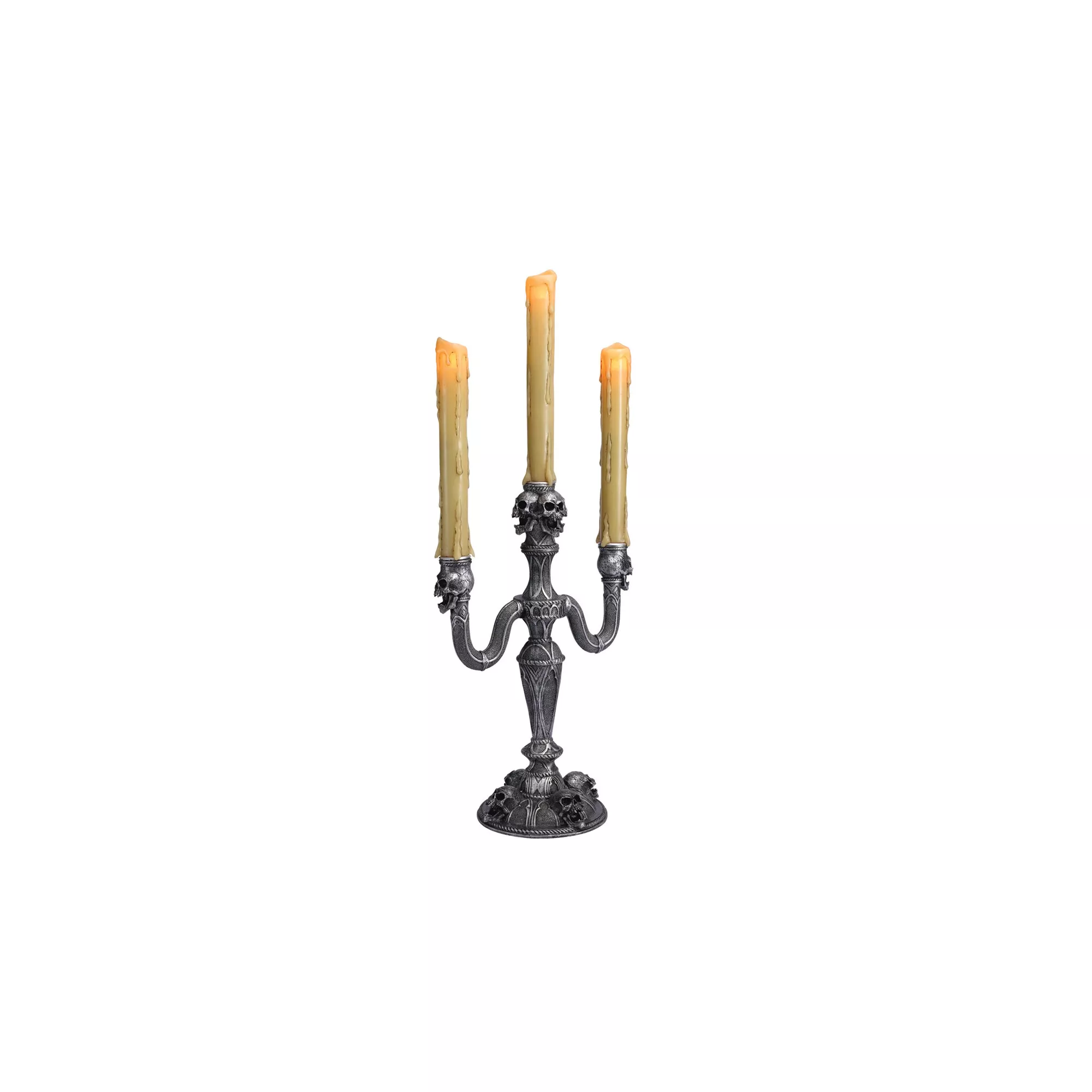 Greet guests and ghosts alike when you carry this Gothic Skull Candelabra complete with authentic looking illuminated candles. The faux metallic candelabra looks as if it was taken from the mantel of a haunted castle - scare up some fun with this creepily clever and practical prop!
