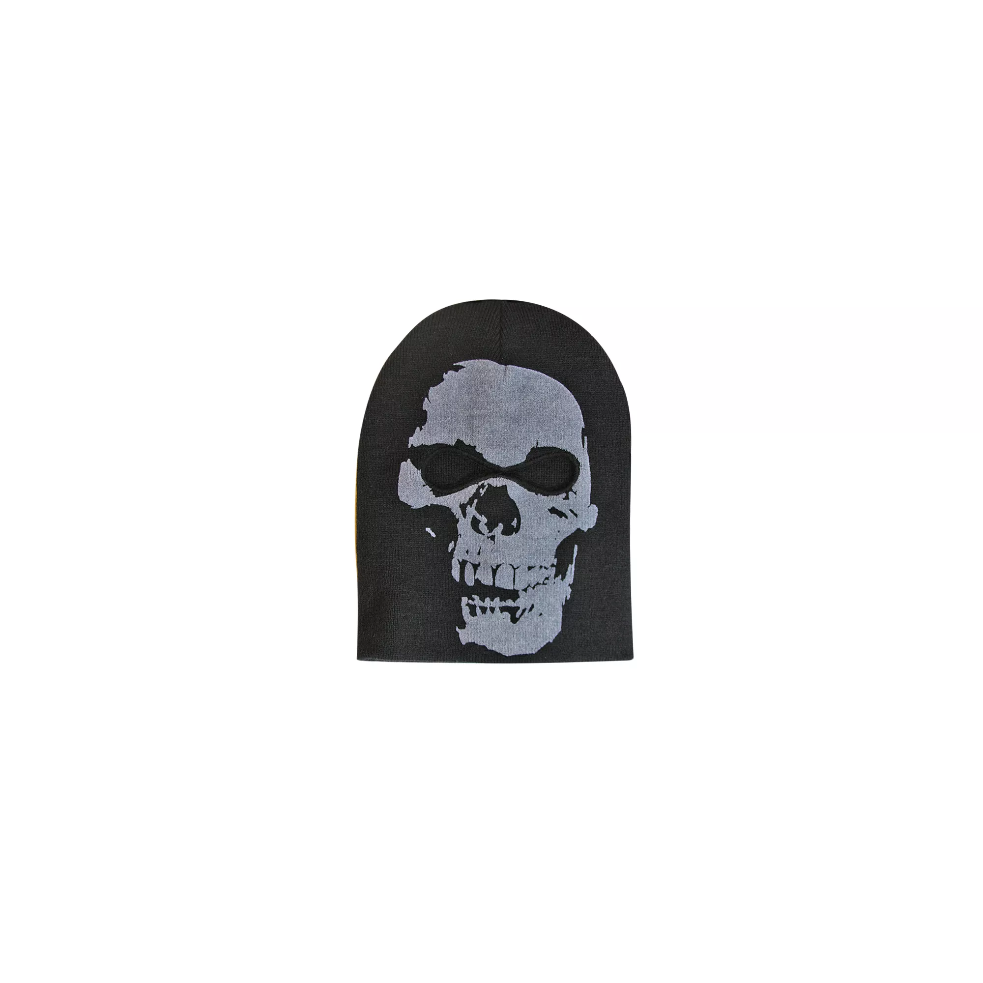 Frolic fearfully through the night in this Skull Knit Mask. The mask features a black knit material with a grey skull face, which provides cut-outs where the skulls eyes are, so you can see all your potential victims.