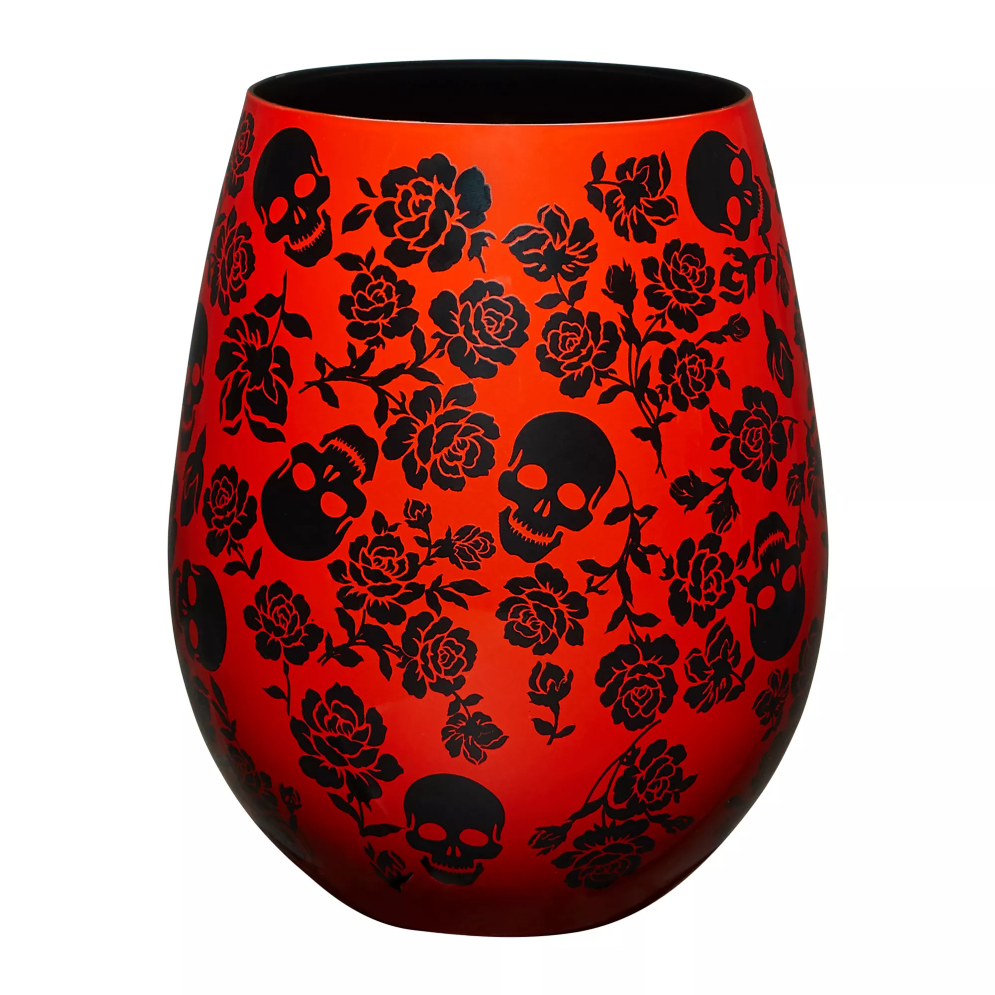 Relax with a glass of your favorite drink once you get your hands on this decorative Skulls and Roses Stemless Glass. This red glass features a beatiful pattern of skulls and roses all over and is sure to give you those gothic noir vibes.