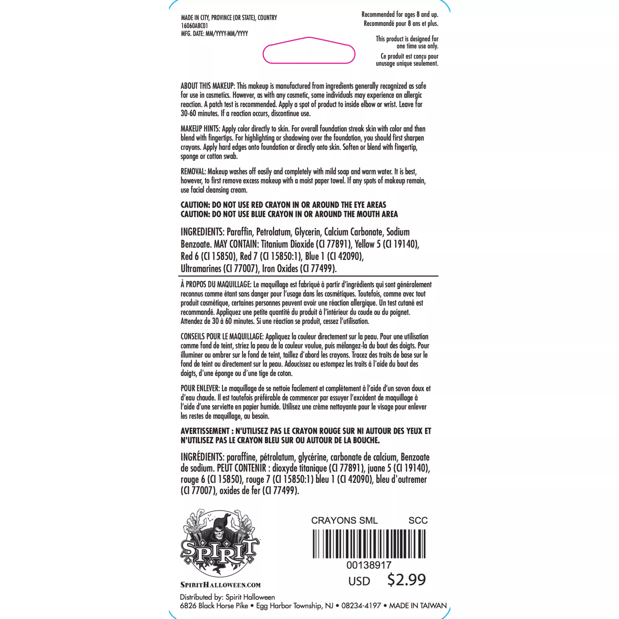 Add colorful detail and enliven any costume with these handy Small Makeup Crayons. Show off your artistic side and craft fine lines, geometric designs or realistic stitches and wounds. Bring a vampire, clown or zombie costume completely alive!