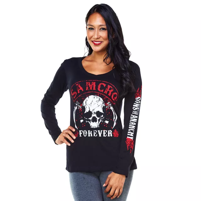 Make sure you're all geared up for riding with the crew when you wear the officially licensed Sons of Anarchy Forever Long Sleeve V-Neck T-Shirt. This black, cotton long sleeve tee features red, white and grey lettering and graphics.