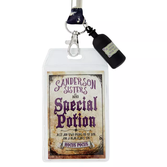 Carry your keys and ID easily in this official Special Potion Hocus Pocus lanyard! Show off your favorite movie with this fun lanyard that has a small potion charm and reads "Sanderson Sisters, est. 1693, Special Potion, just add two drops oil of boil and a dead man's toe." It's perfect for any Hocus Pocus fan! The double-sided strap reads "It's just a bunch of Hocus Pocus" in white on purple on one side and features skulls on the other side.