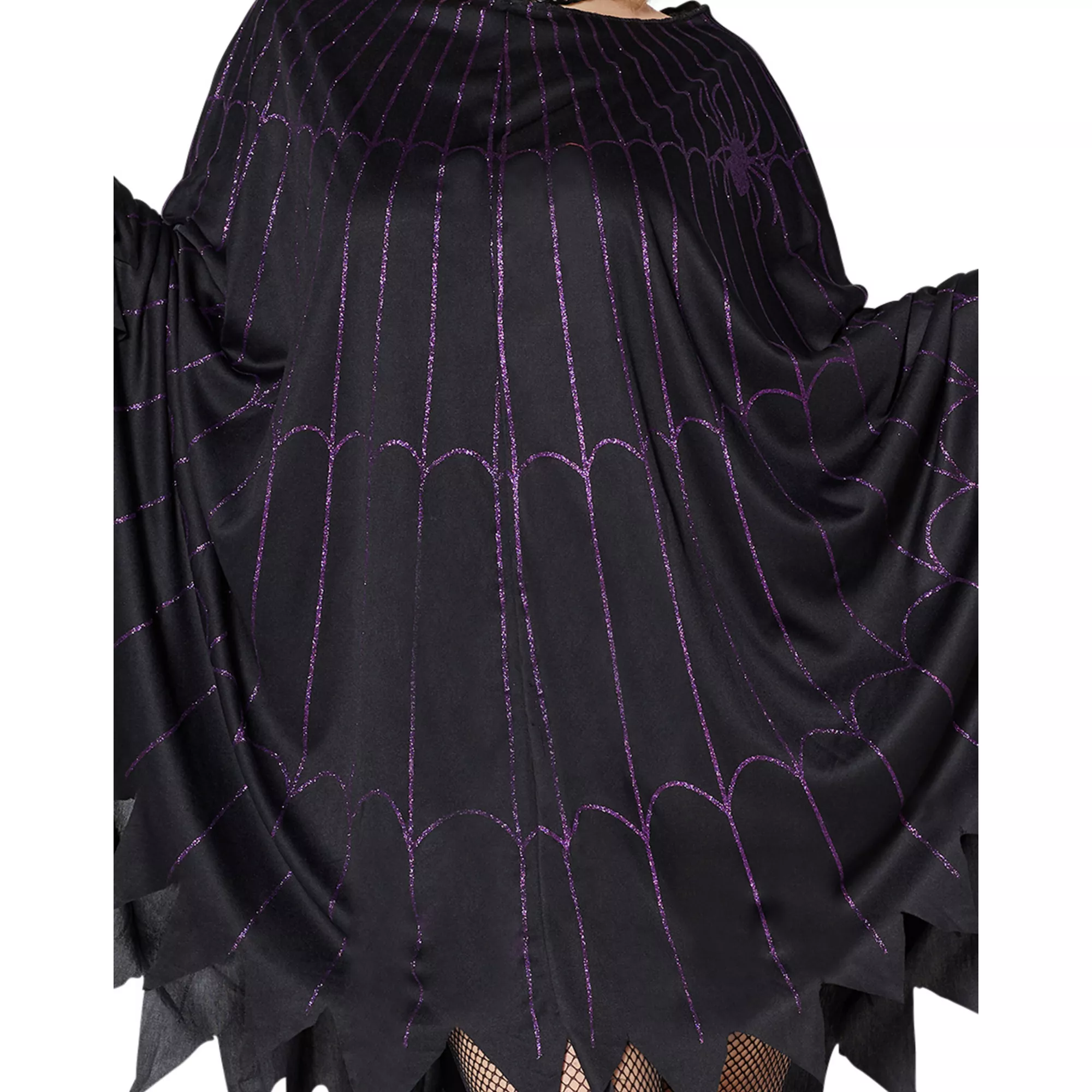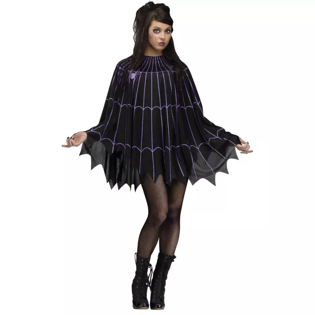Polish your spider themed look with this Spider Web Black and Purple Poncho! Capture everyone's attention in this stylish web designed black poncho with purple web and spider graphic! Perfect accessory to a spider themed costume (sold separately) or over a pair of dark leggings!