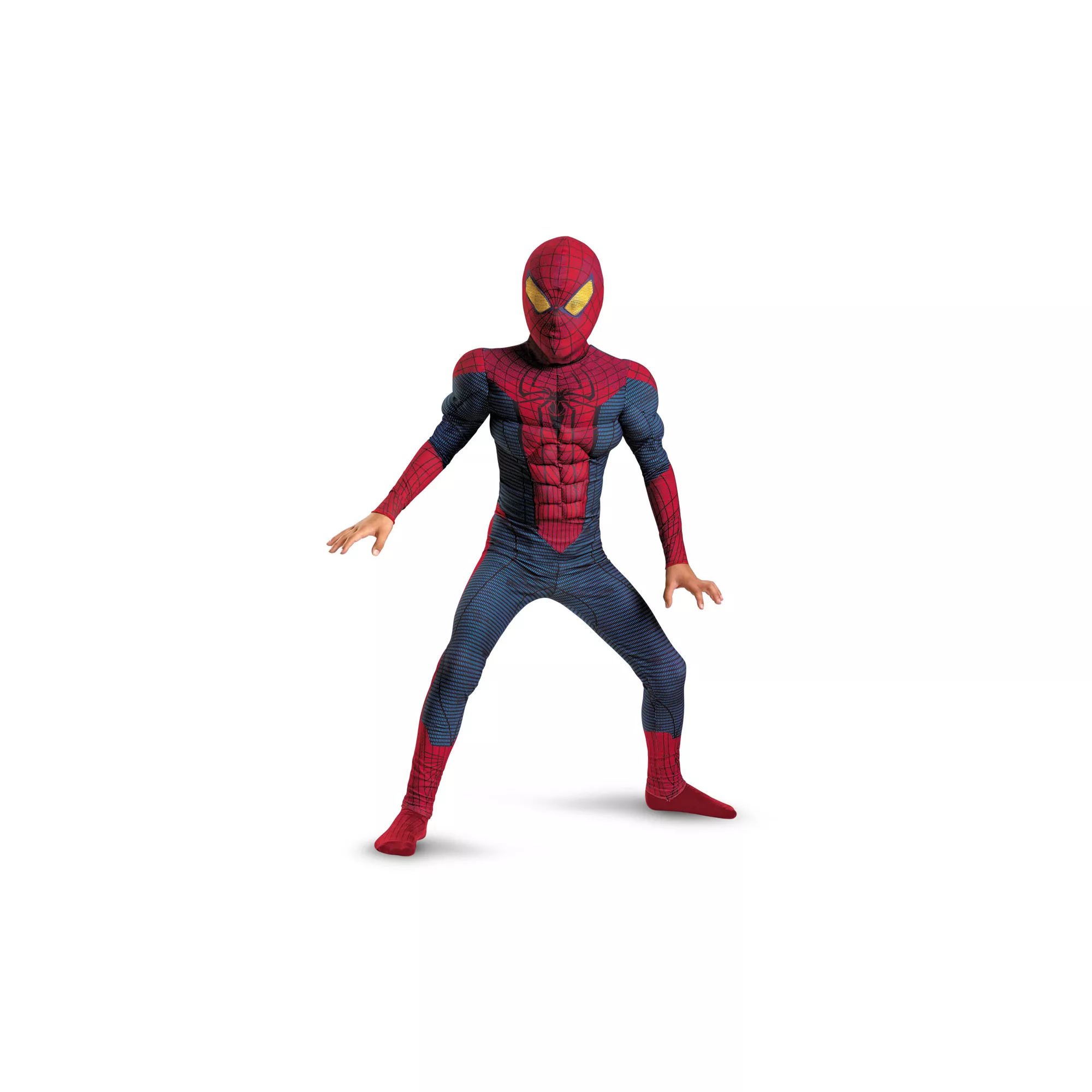 Light up whatever web you weave on Halloween when you wear this officially licensed Spider-Man Movie Light-Up Muscle child costume. The red, blue and black character jumpsuit features a muscle torso and arms, complete with a character hood and batteries.