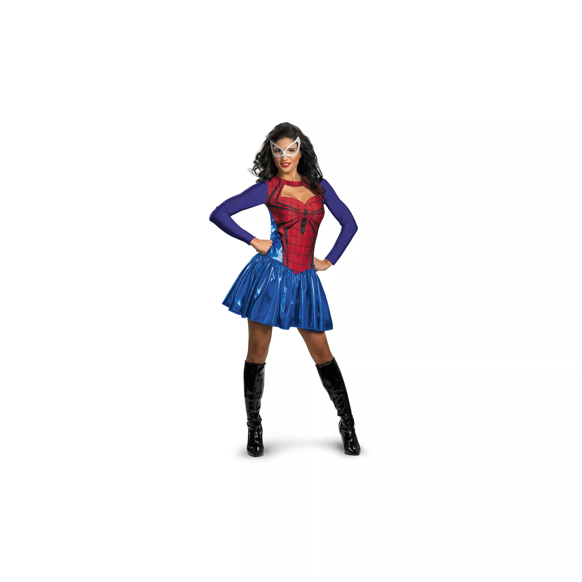 Swing in to save the day when you don this sexy and officially licensed Spiderman Spidergirl classic adult womens costume. The red, black and blue character inspired dress comes complete with silver eye mask, so you can keep your identity under wraps.