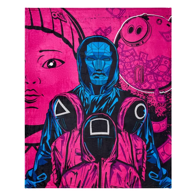 Bring the chilling suspense of Squid Game right to the comfort of your home with this officially licensed fleece blanket. Soft and stylish, this blanket features detailed images of Front Man, Young-Hee, and a trio of soldiers, making it an excellent choice for fans of the epic TV series.