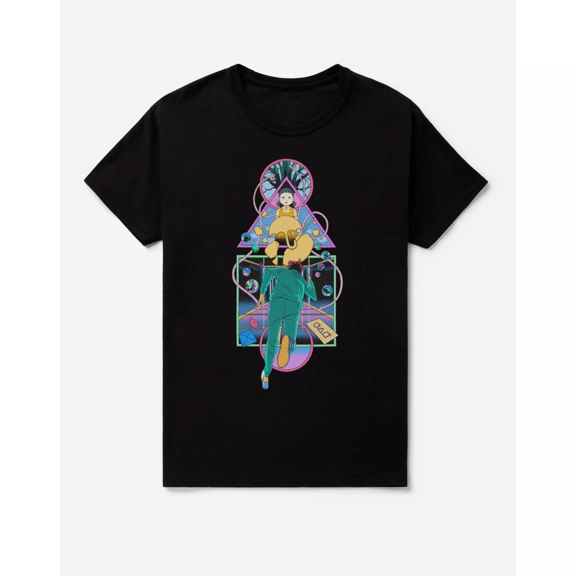 Run for your life. This heart-pounding Squid Game t shirt features a desperate player alongside graphics inspired by games like red light, green light, the glass bridge, and more.