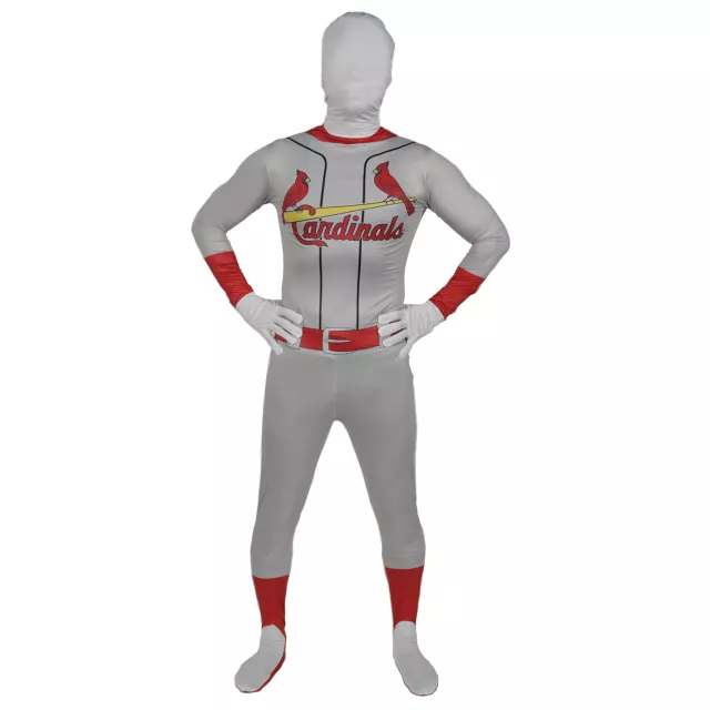 Play ball! Party at the game or prowl the town on Halloween in this officially licensed and totally awesome adult's St. Louis Cardinals superskin costume. Hit it out of the park on Halloween. The costume completely conceals your identity yet you can both see and breath though it with ease.