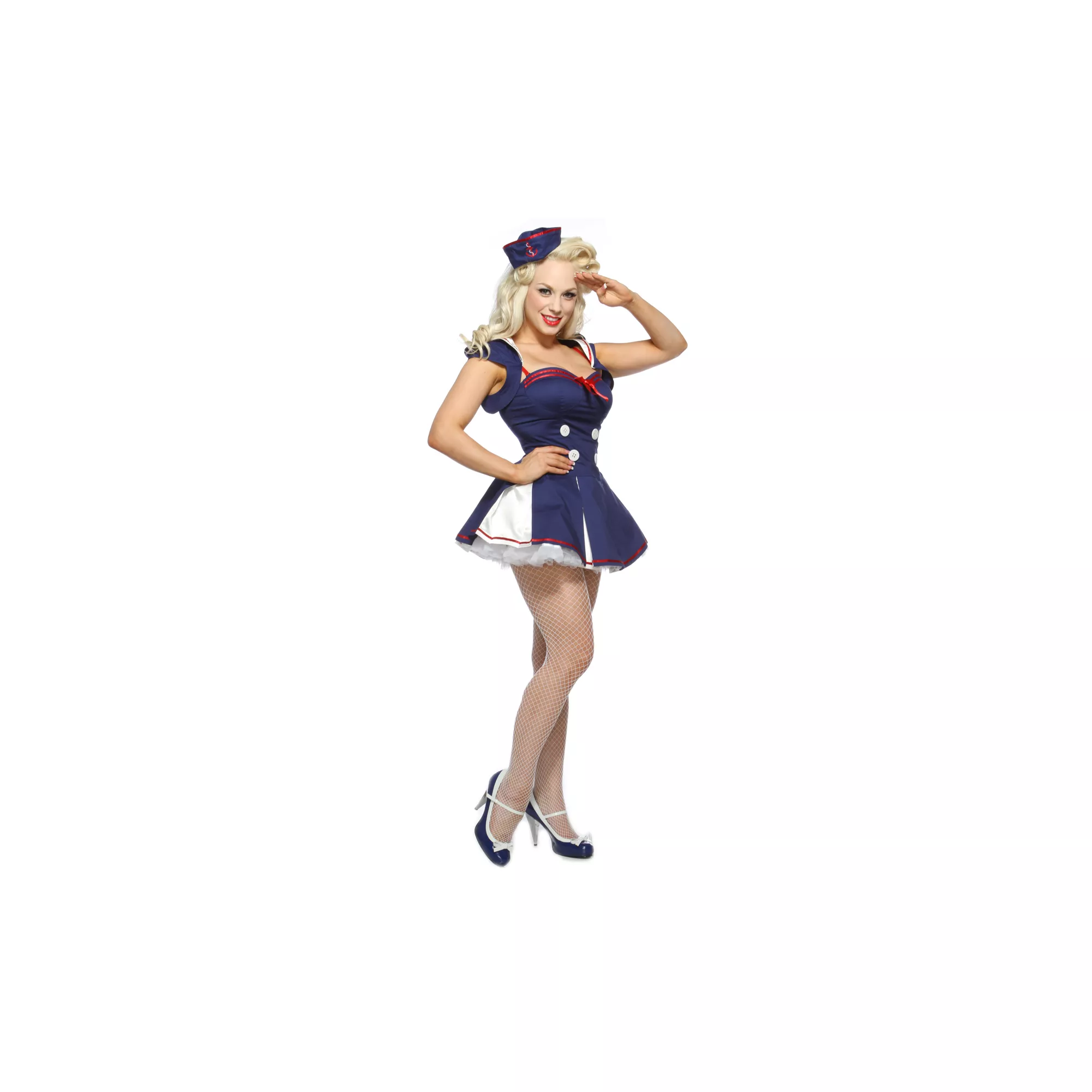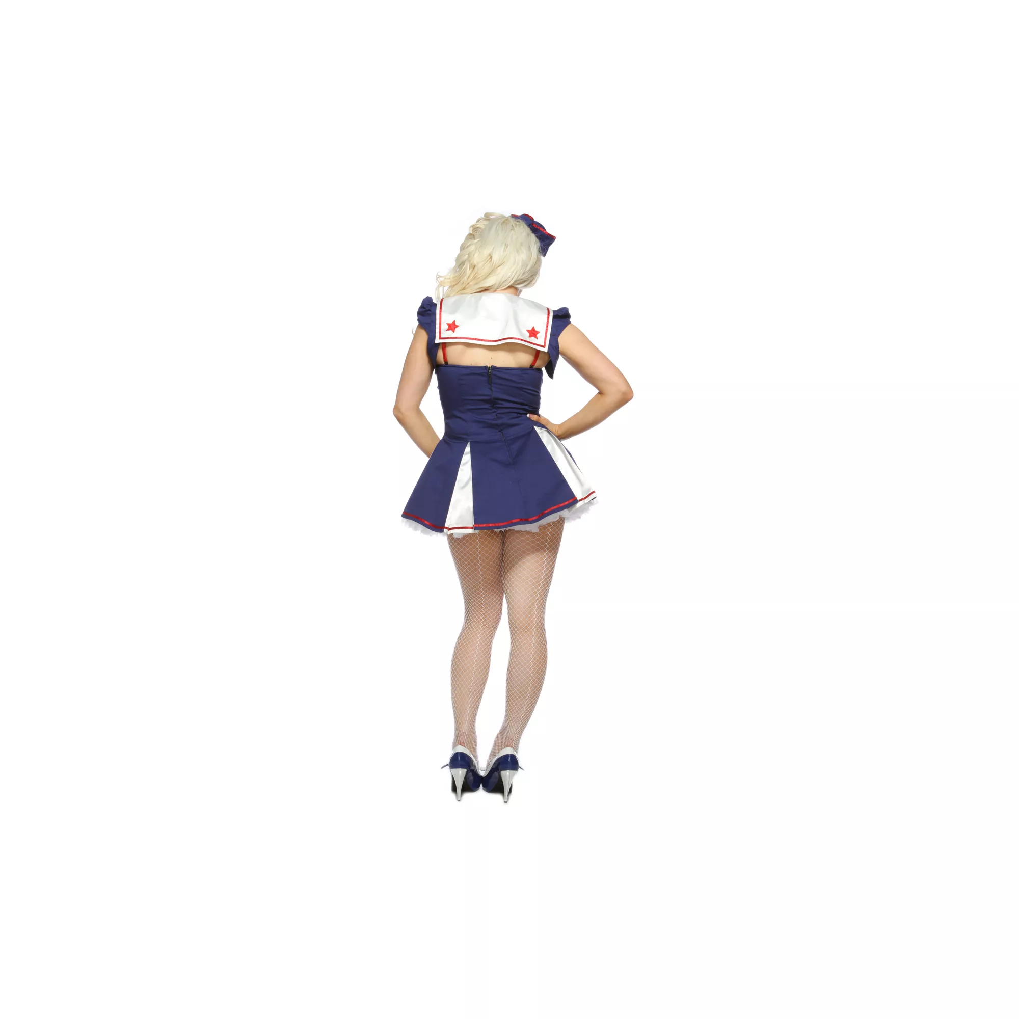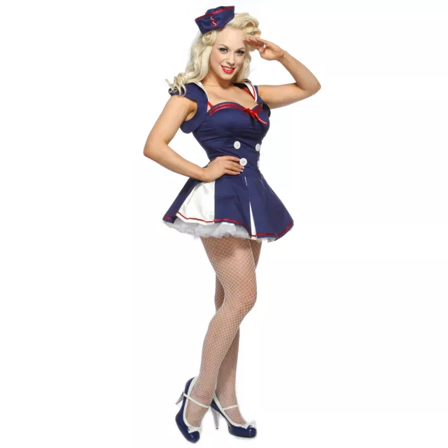 Get ready for a twenty-one gun salute when you don this Star Spangled Sailor adult womens costume! The red white and blue pin up dress of this sailor costume features adjustable straps and comes complete with a matching shrug along with a nautical collar and a cute sailor hat.