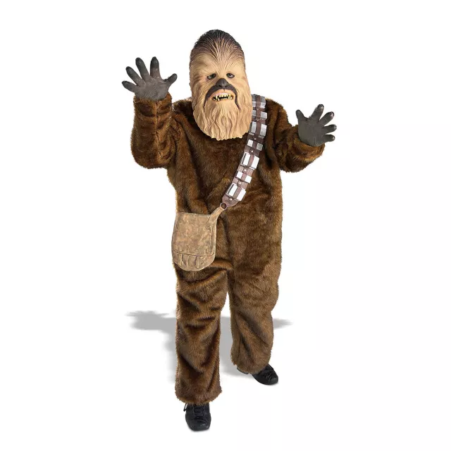 Take center stage on Halloween and conquer galaxies when you wear this Star Wars Chewbacca deluxe child costume. The 100% polyester dark fur bodysuit comes complete with an overhead latex mask, gloves along with a bandolier and pouch.