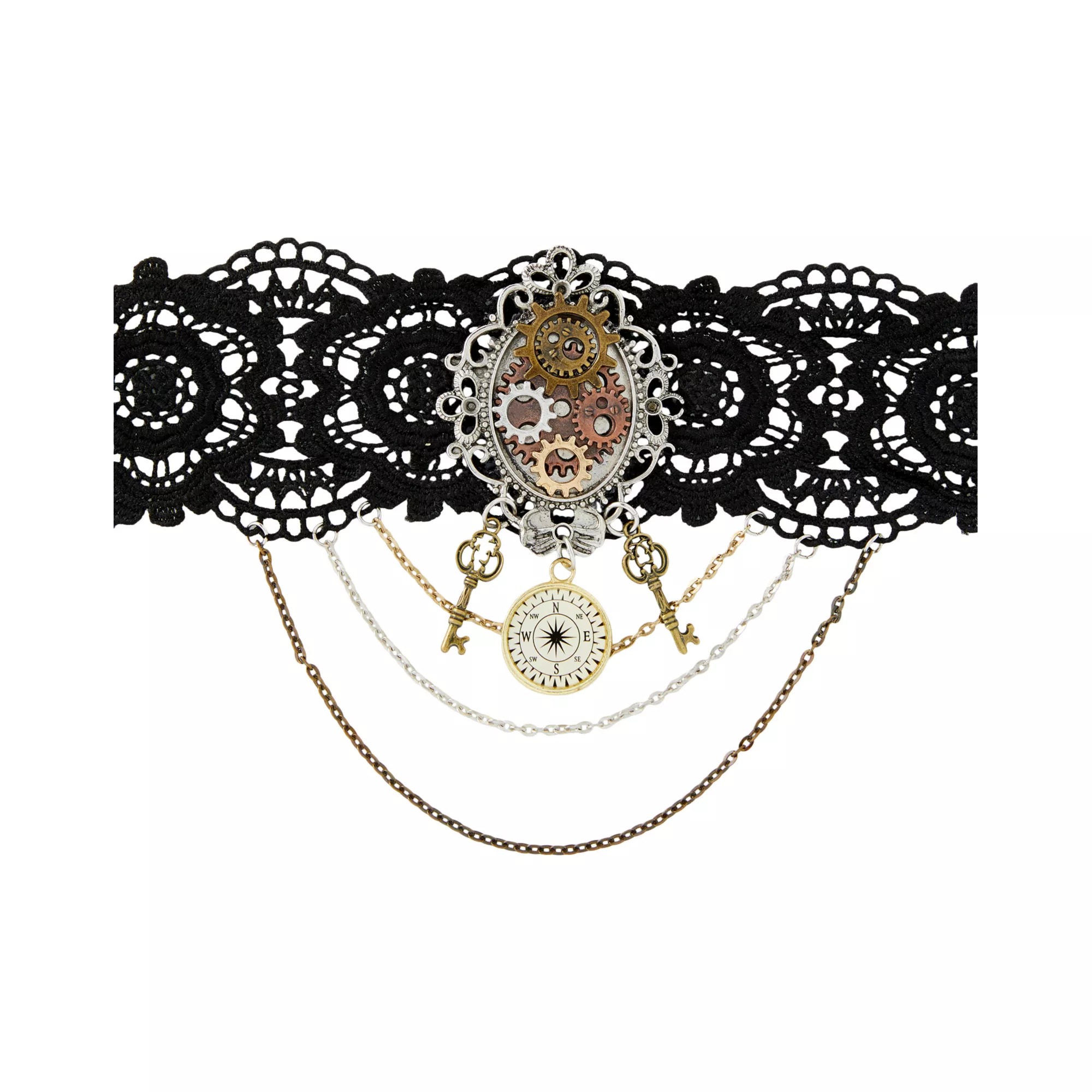 Make your style futuristic and timeless with the Steampunk Choker. This velvet ribbon choker features gold metal chain detail, gold heart charm and gears.